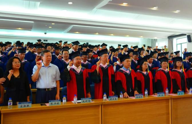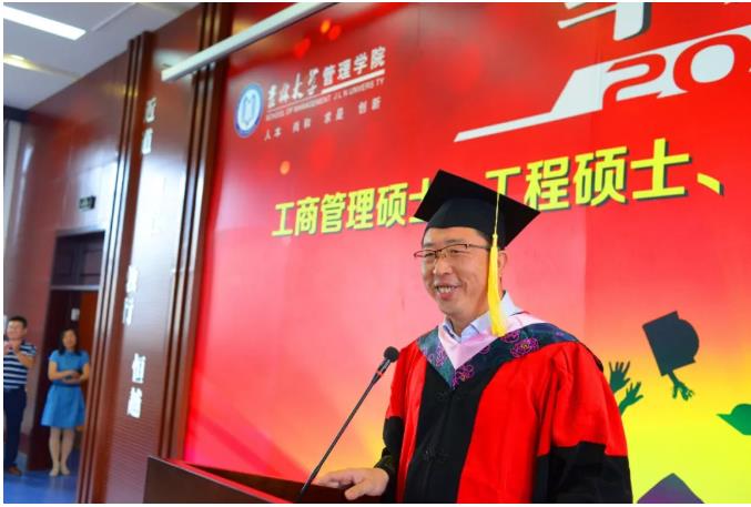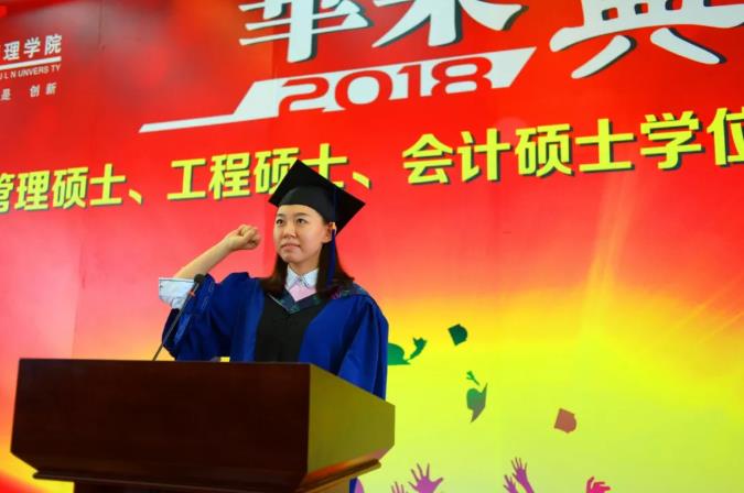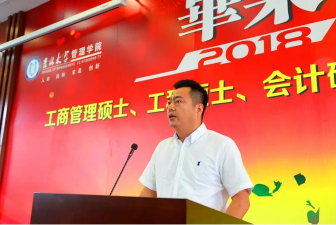 典礼进行第四项:实破生花,放飞理想。追逐美好理想,谨守法律道德底线是管理学院对同学们的嘱咐与期望,承载着这份嘱托,毕业生们跟随领誓人2018届MBA毕业生胡畔一起进行了诚信宣誓。接下来,吉林大学管理学院MBA联合会代表,2015级MBA班长,中粮集团高级经理刘凯代表历届MBA学长及吉林大学管理学院MBA联合会致辞。刘凯说,联合会向大家敞开大门,欢迎同学们加入,衷心希望同学们秉承校训精神,成就一番事业,回馈社会,回馈母校的培养,回馈自己百战归来在读书的坚持与梦想。然后,教师代表费宇鹏教授致辞。费老师首先祝贺了即将毕业的同学们,并请大家思考:作为一个生长在伟大时代的管理人应该有哪些作为?费老师生动地讲述了英国的英国制造商和工程师马修·博尔顿投资生产并推广瓦特的蒸汽机的故事,以及美国的汽车工程师与企业家亨利·福特成为世界上第一位使用流水线大批量生产汽车的人的故事。这些卓越的管理人激励着同学们把理论付诸实践,用行动开创伟大时代。最后,管理学院院长赵树宽教授致辞。赵院长向各位来宾表示热烈的欢迎,向即将取得硕士学位的同学们表示热烈的祝贺;他叮嘱同学们不忘师恩,砥砺前行。他向同学们提出几点希望与大家共勉:第一,以创新思维回响时代召唤。保持创新思维,就是要有敢为人先的锐气,以求真务实的态度,结合实际积极探索新方法、新途径。不断学习是建立创新思维的根本,坚持学而信、学而思、学而行是创新行为的体现。第二,以创业精神开拓迟迟行道。创业精神就是保持激情,创业精神也是从容乐观,创业精神更是责任与担当,同学们要以负责的心对待生活和事业,克己恬静、宠辱不惊。第三,以赤子情怀坚守致知初心。要在这个充满诱惑与迷茫的社会中不忘初心,首先就必须具有奉献精神,同时还要常怀感恩之心。赵院长表示管理学院会一直关爱着我们的校友,也希望你们能够关心母校的建设与发展。最后,祝愿大家珍惜今天,放眼未来,律己隆法,修身明德,不辱使命,不负重托,前程锦绣,人生幸福!