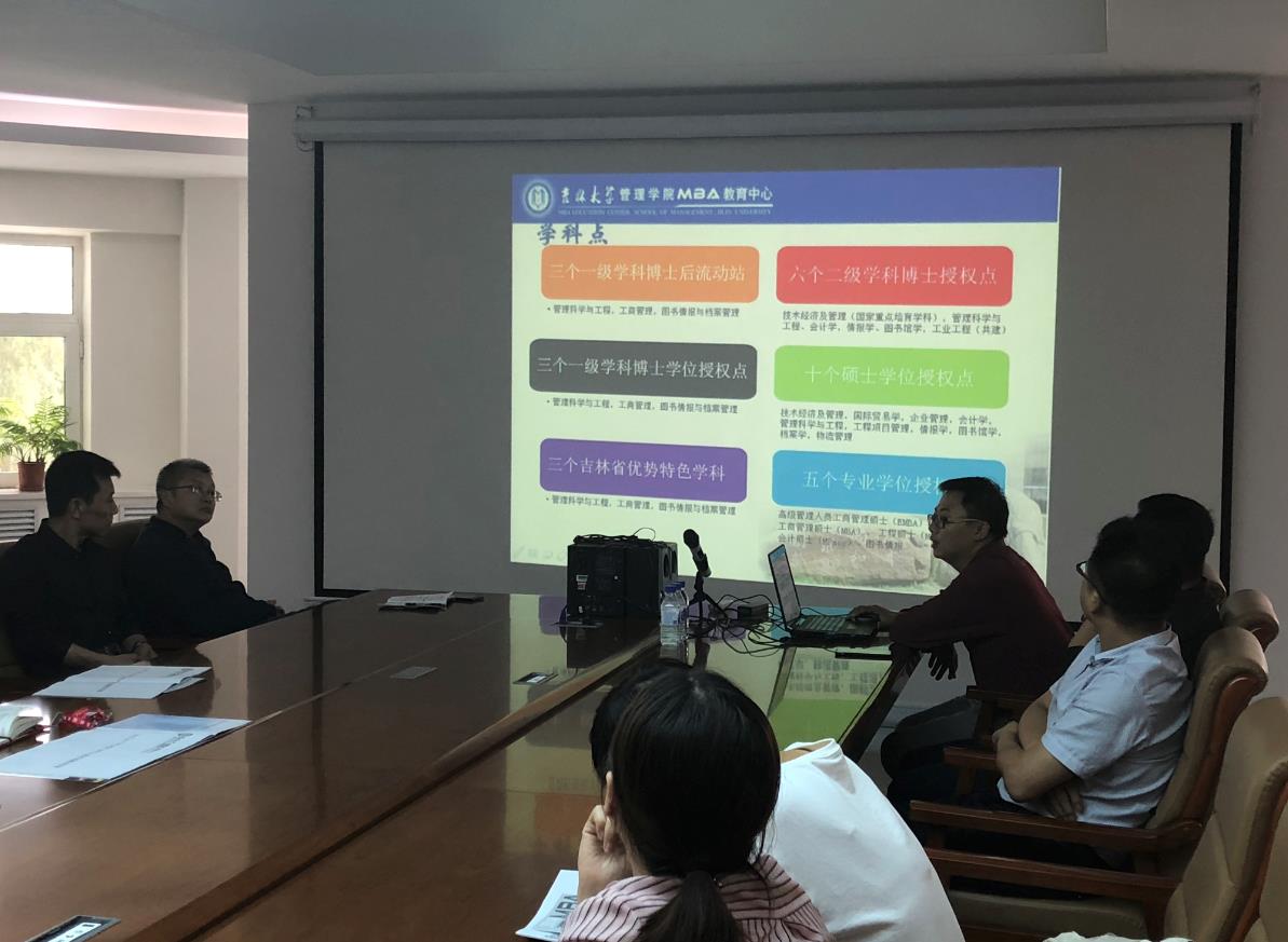 首先,百克人事副总冯总简单的从企业发展过程、目前企业规模、人事设置、基准学历背景以及未来发展方向等几方面对长春百克进行介绍。冯总表示,他本身是吉林大学管理学院毕业的研究生,得益于管理学院完整体系的管理学教育,更感念于管理学院人文环境,虽已毕业多年,对当初的几门课仍然记忆犹新,更表示,百克为生产制造型企业与管理学院MBA的课程设置结构更贴合,这也是组织管理学院走近百克进行经验交流说明的一个基本考虑点,也表示希望本次说明会能让百克高级管理人员更系统的了解2019年MBA报考流程和政策,助力企业员工的考研路。