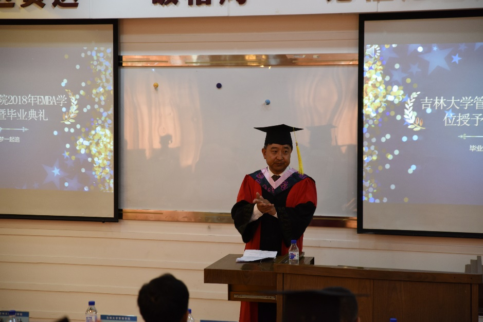 第三项由赵树宽院长为毕业生致辞。首先他代表管理学院向光临本次毕业典礼的各位来宾表示热烈的欢迎,向取得硕士学位的管理学院2013、2014级EMBA学员表示热烈的祝贺。院长在肯定了每位学员的不懈努力,以特有的毅力品质克服了工作及事业方面的诸多困难取得优异成绩的同时,对所有EMBA毕业生与在读学员提出了三点新要求:1、“千年暗室,一灯即明”。 院长希望大家今天毕业于吉大管院EMBA,日后也要养成并保持学习的能力。只有坚持学习才能有助于加快知识更新、优化知识结构、拓宽眼界和视野,从而增强工作的科学性、预见性,在时代浪潮中赢得主动、赢得优势、赢得未来;2、“为学之实,固在践履。苟徒知而不行,诚与不学无异。”院长希望每位管院EMBA毕业生牢记吉大管院EMBA“近贤达、破格局、论恒越之道”的初心,将所学到的知识和才华无私地奉献给国家的富强与民族的振兴事业,做到一个真正具有工匠精神的企业家。3.心系母校。“既入管院门,终为吉大人”希望每个人律己隆法,修身明德,不辱使命,不负重托。