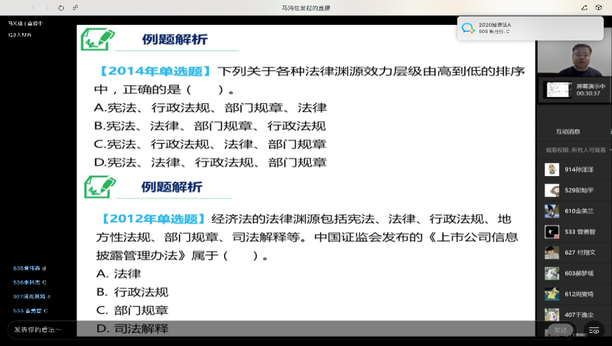 教师在以往的课堂上,面对的是每一个鲜活的个体,能够感知并掌握每个人的听课状态,然而,我们现在面对个摄像头、面对一个冷冰冰的电脑,如何能让课程互动起来,让我们每一位教师感觉不是自己一个人在自说自话呢?这时候,与学生的互动就显得非常重要。比如,下面的例题,在讲解的时候需要和同学们进行互动,此时需要手机和电脑端同时登录企业微信。