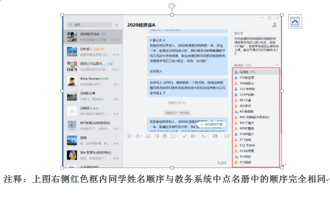 要想利用好“企业微信”平台就要先建立企业微信群(与我们常用的微信群建立如出一辙),首先,授课教师要注册一个企业微信号(一个手机号只能注册一个),把你的企业微信二维码,发给选课班的班长,通知班长加教师为好友。然后,像微信群一样,你可以添加几个班长先成立一个企业微信群,然后公布该微信群的二维码,让各个班班长通知选课的同学加入。再后,在群内你可以发布一个公告:要求进入群的同学按照指定格式修改群昵称,我采用的格式为要按照学号后3+姓名(如果你的选课学生有大于2位数的自然班,你可以选择后4+姓名的格式),这样一来,所有同学在群内的排序,与你从教务系统中打印出来的课程表排序完全一致。至此,你对选课学生名册一目了然,很清楚选课学生是否有遗漏,还有哪位同学没有进入群内,以此实现学生课程群的完美管理。