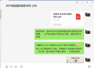 国商系的老师们将学生报名情况进行统计和整理,基于学生的意愿结合老师的要求、学生所希望得到的指导和未来规划,完成了老师和学生的选配,并将选配结果分别通知给老师和学生。国际商务系共八名教授承担指导老师工作,其中有六名博士生导师,两名硕士生导师。目前指导老师和学生都已经通过微信建立联系或已建群,并已经开始指导工作,这对疫情期间同学们的学习和成长无疑有起到了更大的帮助和引导。