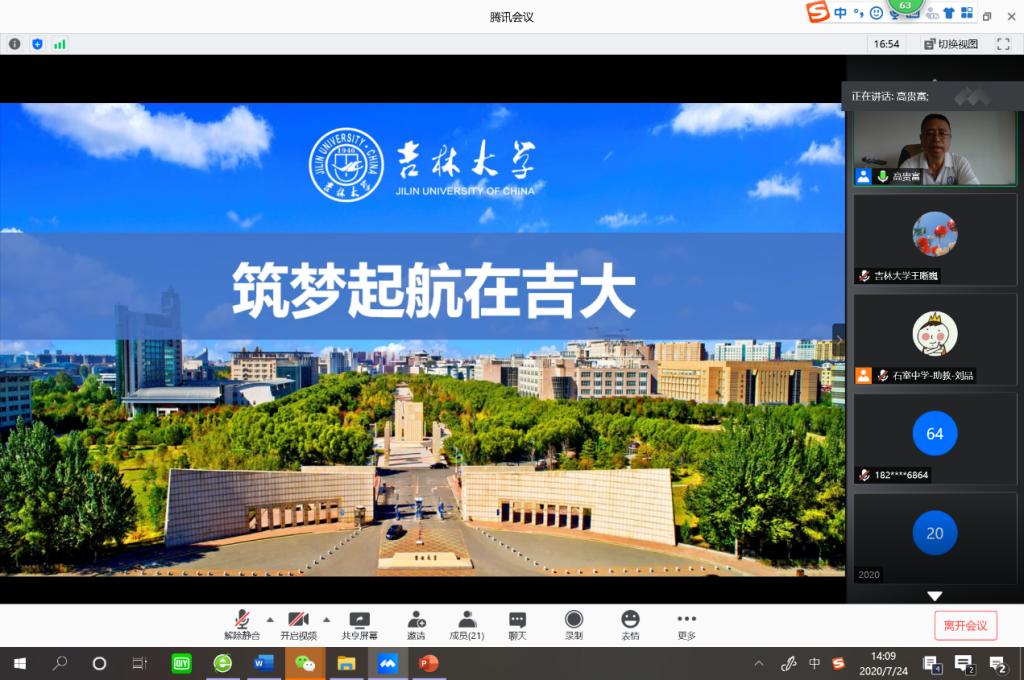 2020年7月24日14:00-15:00吉林大学管理学院以“腾讯会议”在线直播方式对成都石室中学的家长和学生们进行招生宣讲。高贵富老师首先从吉林大学是什么样的大学、学生在吉大的学习和生活、吉大学生的未来发展三个方面介绍了吉林大学,其次从学院发展历程、师资队伍情况、学科点建设情况、人才培养、国际交流合作等7个方面介绍了吉林大学管理学院,最后重点介绍了吉林大学在四川省2020年招生计划和近三年各个专业录取情况,并对吉林大学2020年四川省高考投档线进行预测。王晰巍、杨红、窦平安、巩顺龙、王东、郭宇等老师针对学生提出的问题和相关招生政策进行了详细的解答。