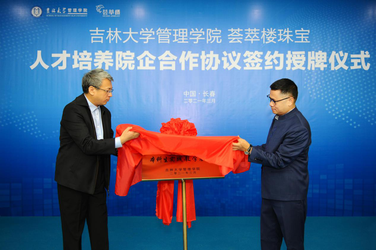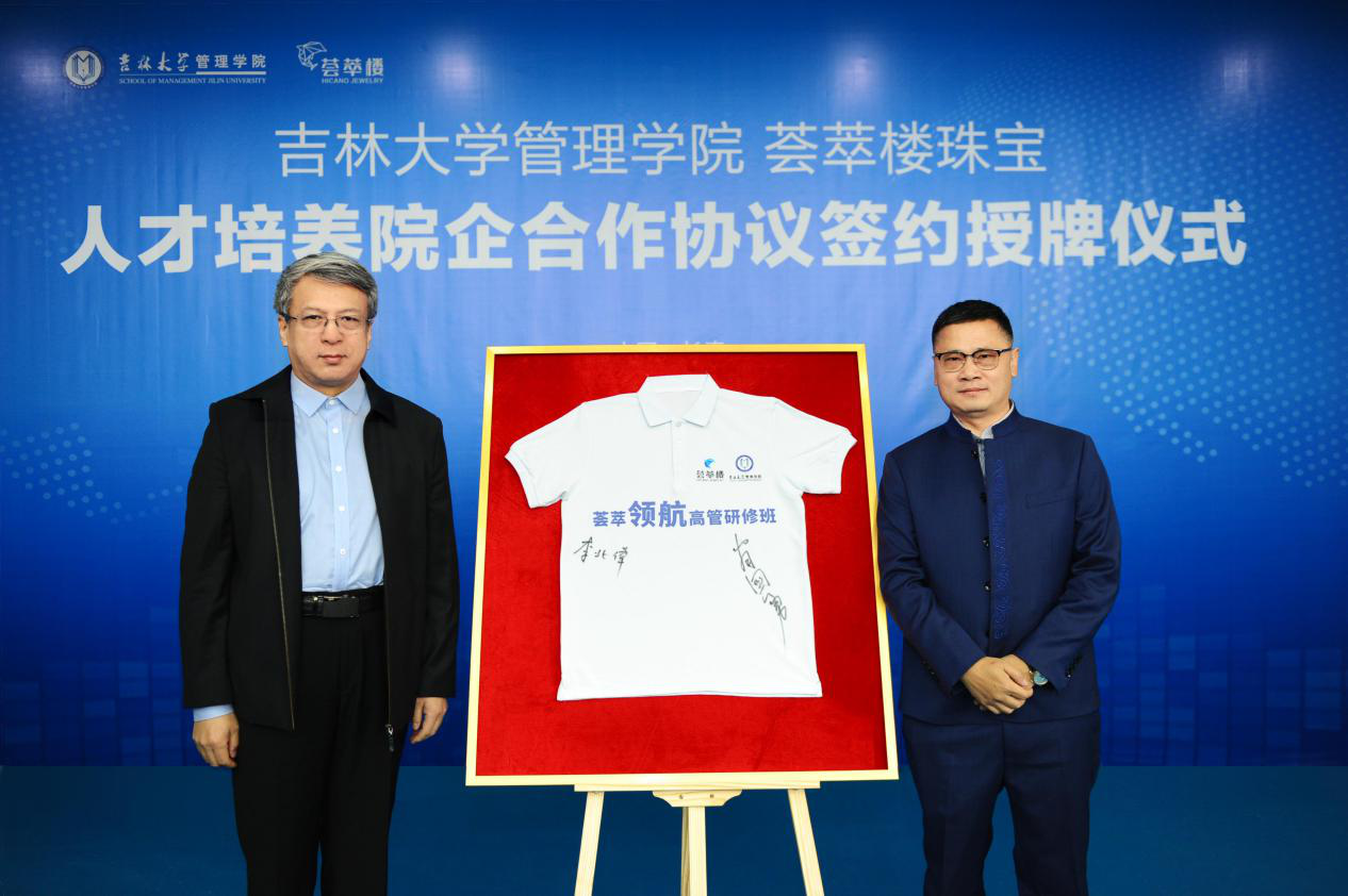 在双方共同见证下,深圳景福元记珠宝有限公司商学院院长柳红艳女士与我院党委副书记彭鹏副教授签订战略合作协议。双方本着优势互补、共同发展的原则,达成“吉林大学管理学院实践教学基地”合作协议。李北伟院长亲自授予荟萃楼珠宝“本科生实践教学基地”牌匾;翁国勇总裁和李北伟院长共同在荟萃领航高管研修班的纪念版文化衫上签名,作为荟萃楼珠宝开启人才战略的鉴证。