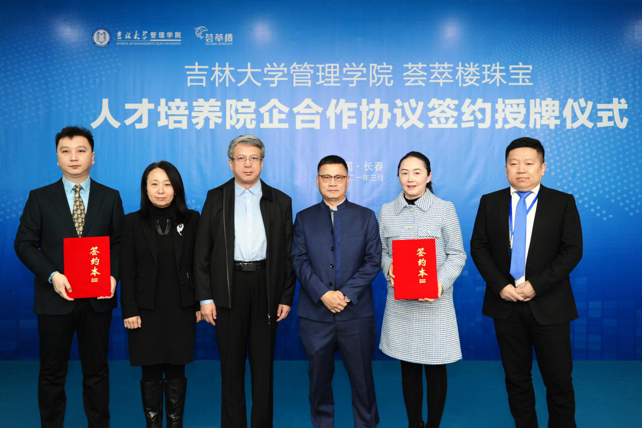 2021年3月18日上午,吉林大学管理学院与荟萃楼珠宝集团人才培养院企合作协议签约授牌仪式暨领航高管研修班开班典礼,在吉林大学南岭校区逸夫教育大楼行知厅举行。深圳景福元记珠宝有限公司总裁翁国勇先生、吉林大学管理学院院长李北伟教授、副院长樊雪梅教授、党委副书记彭鹏副教授等出席本次签约仪式,双方就院企合作带动人才培养以及企业高层管理者素质研修等进行深入沟通,并形成高度共识。