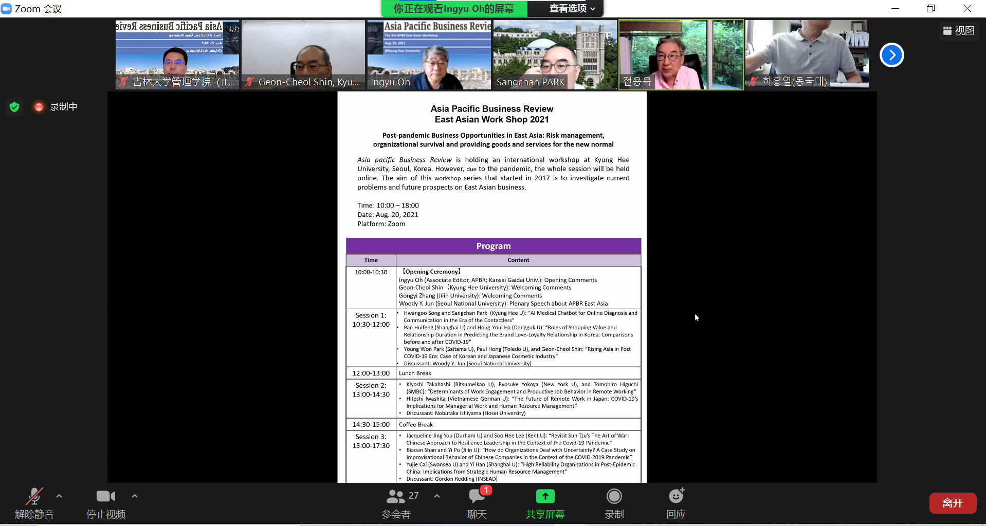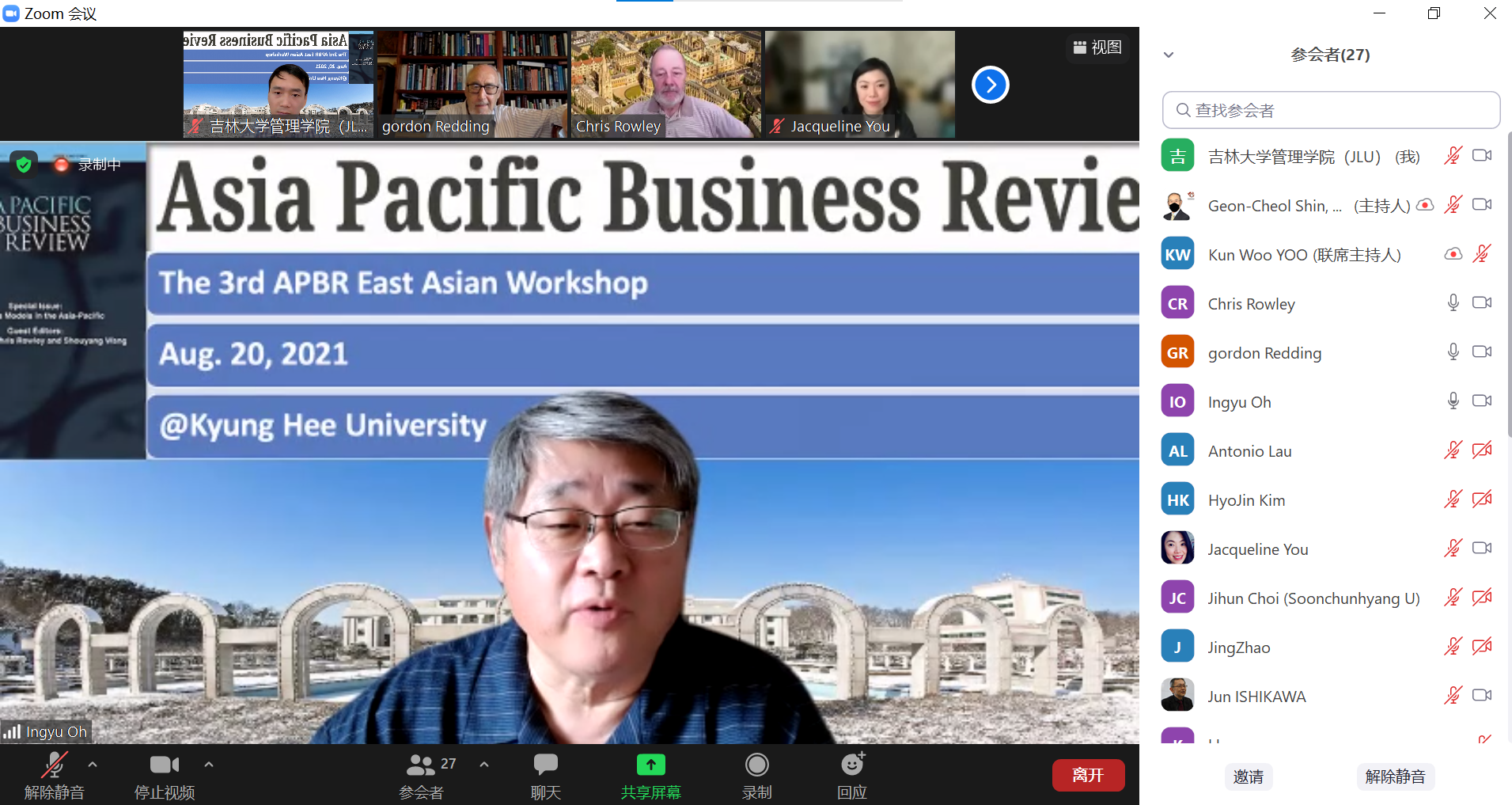 第三届“Asia Pacific Business Review(APBR)东亚地区会议”于2021年8月20日通过ZOOM平台以“云端”形式召开,本届会议由《亚太商学》英国国际期刊(APBR)主办,韩国首尔庆熙大学承办。该会议以“东亚疫情后的商机”为主题,旨在探讨包含“风险管理、组织生存以及为新常态提供商品和服务”在内的东亚企业当下面临的问题与挑战以及未来的发展方向及机遇。来自中国、英国、日本、韩国、印度等国家的17名代表参加会议。我院副院长张公一、副教授单标安及一名研究生代表应邀参加会议。