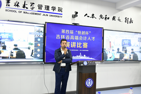 本次演讲比赛历经班级选拔、初赛,复赛、决赛四个阶段,12个期班近360名会计领军学员参与了本次活动,9名优秀选手最终入围决赛。复赛、决赛环节,学院邀请了吉林电视台著名主持人赵琛、吉林艺术学院戏剧影视学院副院长冷炎、吉林大学文学院教授刘迎新、管理学院副院长李雪灵、吉林大学团委副书记张大权等担任现场嘉宾评委,吉林省财政厅会计处处长常忠利、调研员聂国富、会计领军人才培养基地全体人员以及各期培训班负责人在比赛现场为参赛选手加油助力,管理学院副院长樊雪梅做了简要致辞。