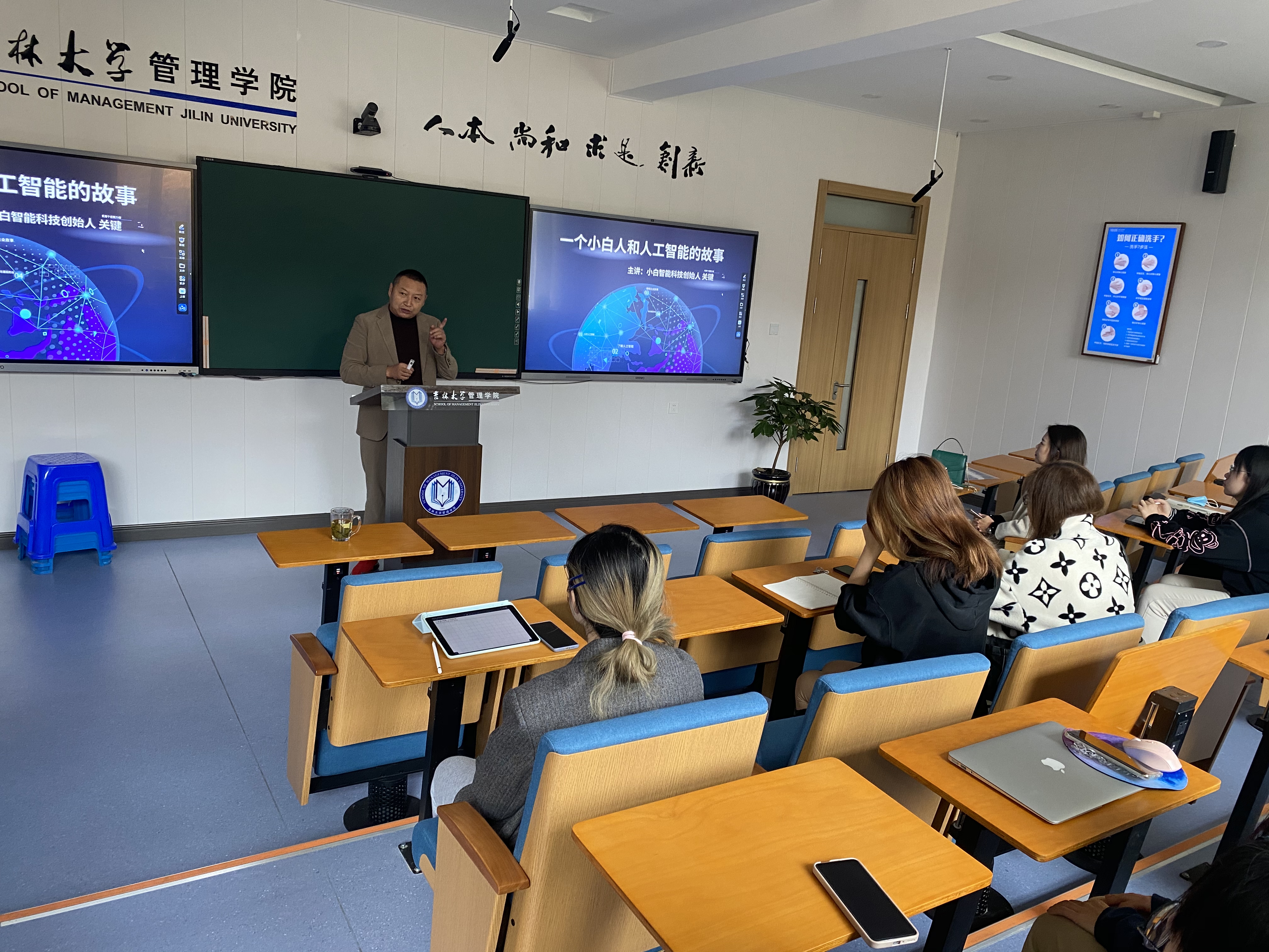 讲座以“一个小白人和人工智能的故事”为主题,通过一段“华智冰”的短视频引入人工智能的正题。首先关总用生动形象的语言介绍了“AlphaGo大战李世石”、无人驾驶汽车、“阿尔法巴”公交车、手术机器人、AI试衣、AI美甲、科创板AI相关企业等广为人知的现实案例,引领同学们直观认知什么是人工智能,让同学们意识到各种无人化办公和服务场景就在我们的身边。然后关总介绍了人工智能的发展方向是什么,通过“基础层、技术层、应用层”三层的人工智能产业链图谱总结出“智能+行业”是目前人工智能重点的发展方向,如“智能+医疗”、“智能+餐饮”、“智能+交通”、“智能+安防”、“智能+教育”、“智能+零售”,并举例说明未来手术医生和餐厅服务员等职业将由人工智能来服务。接下来关总以小白智能科技的企业发展过程作为案例,分享了自己对于企业管理的宝贵心得。