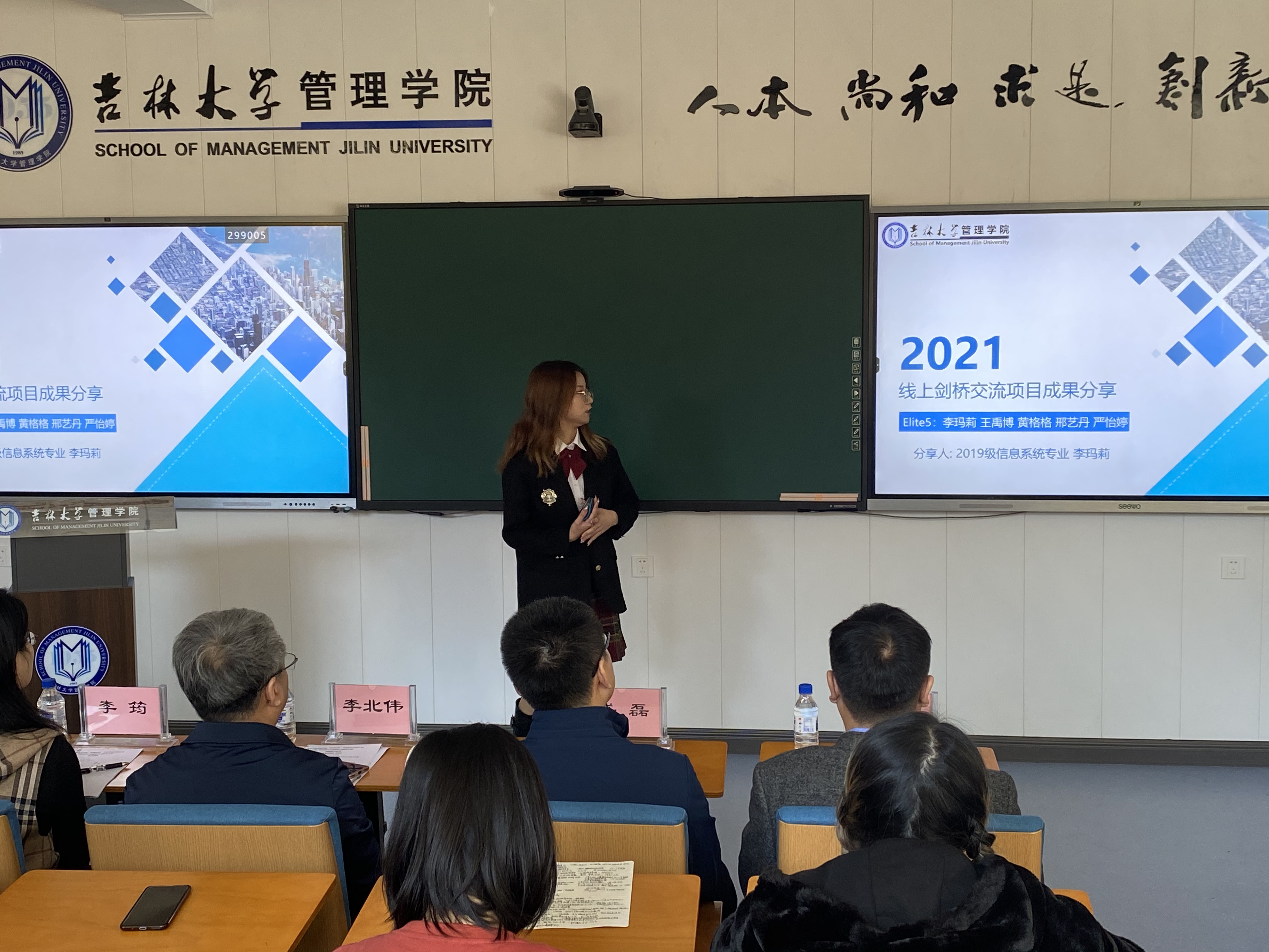 首先,管理学院院长李北伟进行致辞,他表示本次项目符合管理学院推动学科融合与创新,培养学生的可持续发展能力、国际竞争力的人才培养理念,为后疫情时代全面提升管理学院本科生综合能力以及国际交流搭建了有效平台。李院长对同学们在项目中的优异表现表示了由衷的欣喜并希望同学们将来可以着眼学术根本,勇于创新研究,走向可期的未来。然后,国际合作与交流处副处长李筠讲述了在项目过程中为学生设置的保障机制,肯定了管理学院此次项目取得的丰硕成果,希望能从师生角度获得更多的反馈从而为接下来的工作积累经验并鼓励大家积极参与到接下来举办的活动中,更好地提升自己。接下来,党委学生工作部部长副部长盛磊阐述举办这一活动的初衷是培养更多兼具国际视野和家国情怀的“领袖”人才,因此,他希望未来在学校党委的坚强领导下,学生工作部与管理学院能携手推动“三全育人”综合改革,不断丰富和创新吉林大学思政育人的体系模式。接下来,管理学院2019级优秀学生代表李玛莉从项目版块介绍、项目进展以及项目成果展示三个方面与大家进行了精彩的分享,讲述了她所在的整个小组在项目中的规划与收获。最后,管理学院党委副书记兼副院长彭鹏宣布了本次项目的优秀学员,国际合作与交流处、学工部及学院领导为25名结业生颁发证书,并对获奖的同学们依次表示祝贺。
