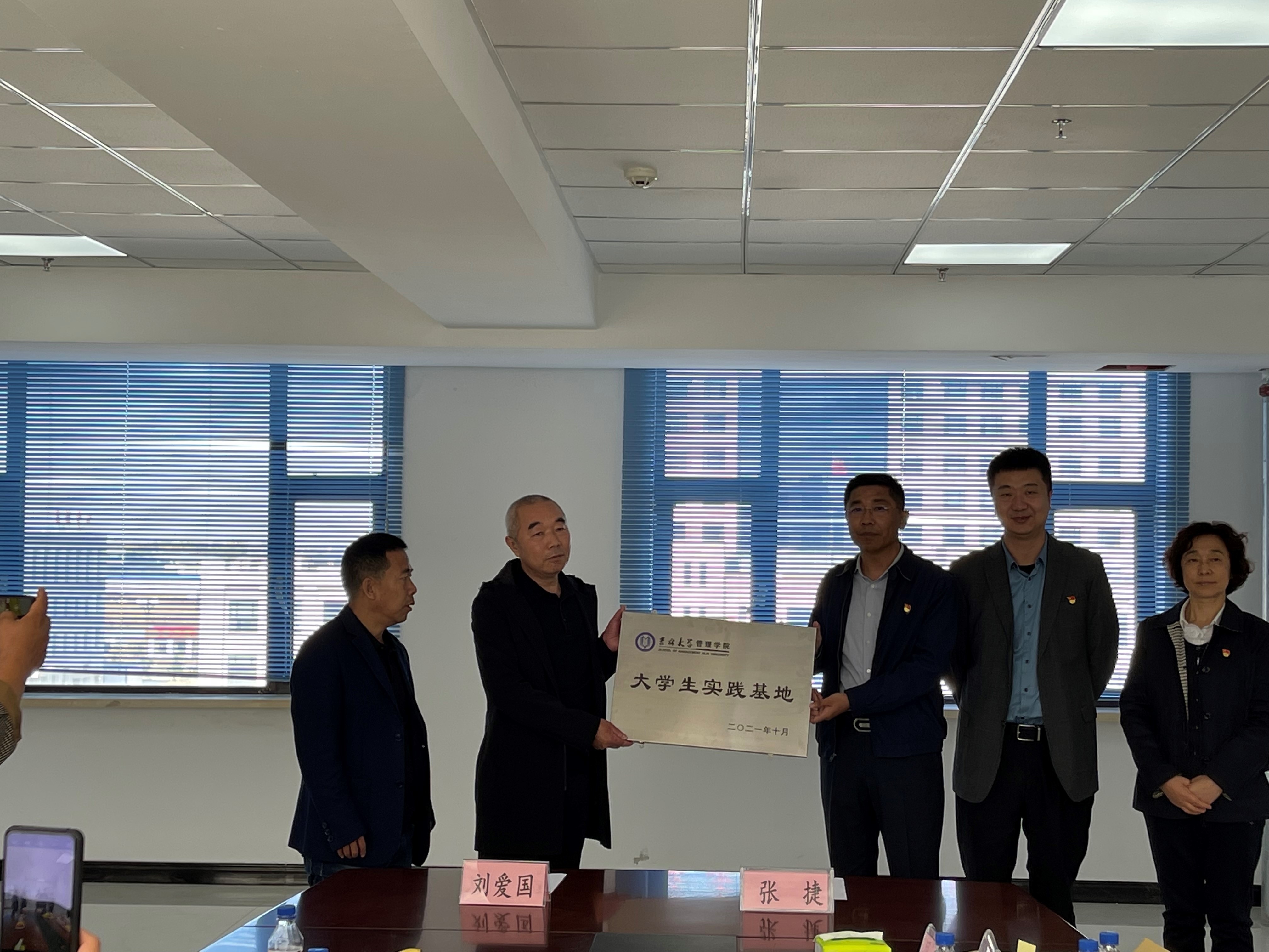 吉林大学管理学院党委副书记张捷、大安市档案馆副馆长刘爱国代表双方在《吉林大学管理学院与大安市档案馆合作备忘录》上签字。赵军书记为大安市档案馆“吉林大学管理学院大学生实践基地”授牌。