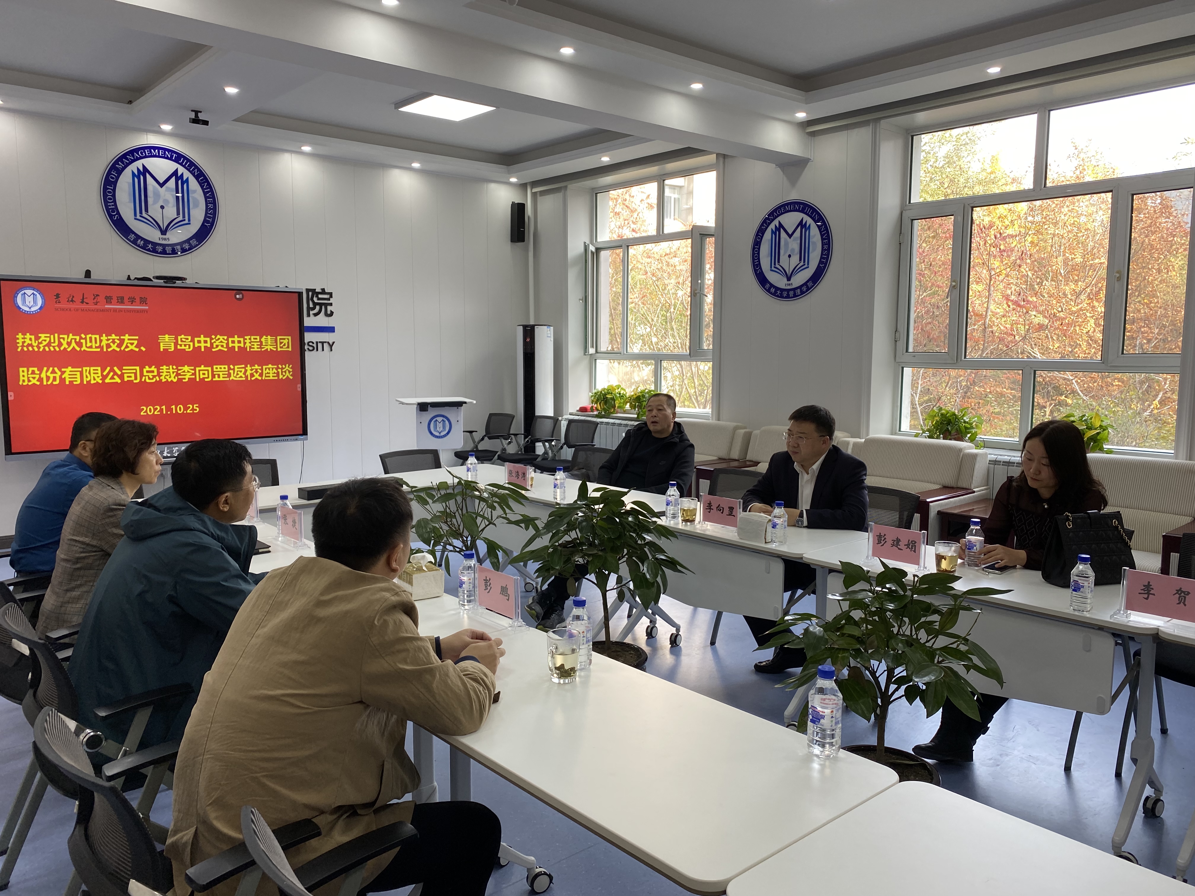 1025日上午,我院优秀校友、青岛中资中程集团股份有限公司总裁李向罡回到管理学院,与学院教师座谈。学院党委书记赵军、党委副书记张捷、党委副书记兼副院长彭鹏、行政副院长马腾以及部分业务教师代表参加本次座谈会。