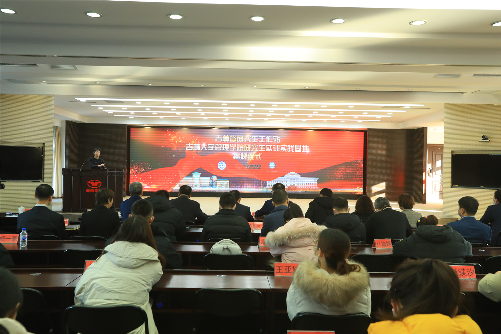 11月25日下午,我校与吉林亚泰(集团)股份有限公司联合建设的吉林省研究生工作站和吉林大学管理学院研究生实训实践基地揭牌仪式在吉林亚泰(集团)股份有限公司会议厅隆重举行。吉林省教育厅科研产业处副处长闻博,校研究生院副院长兼培养办公室主任徐淮良,校研究生培养办公室副主任宋淑敏,亚泰集团副董事长、总裁刘树森,亚泰集团副总裁、总经济师王化民,管理学院院长李北伟,副书记张捷,副院长李雪灵,副院长马腾及校内外相关单位领导和师生代表参加了揭牌仪式。仪式由李雪灵副院长主持。