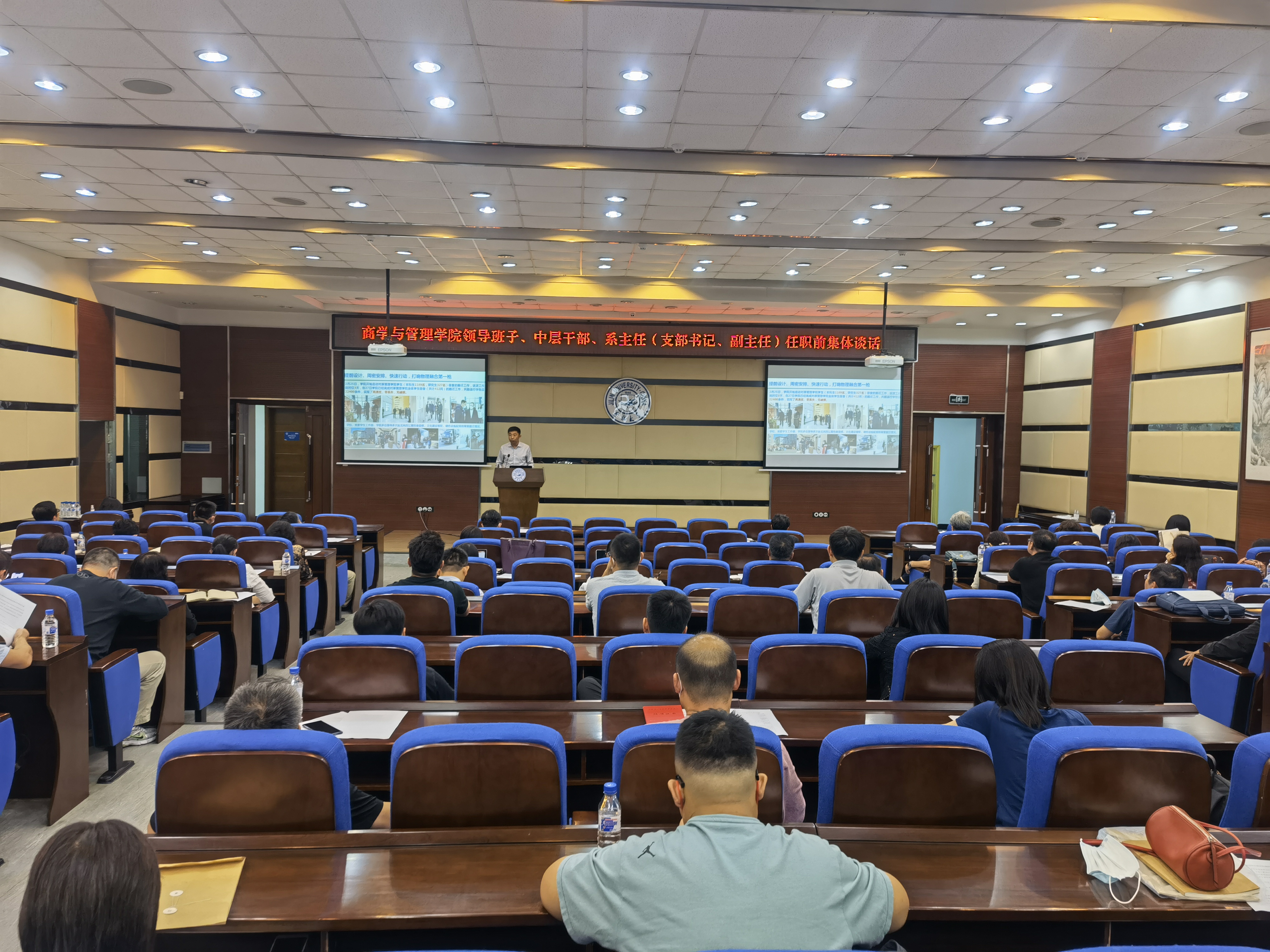 8月24日下午,商学与管理学院在东荣大厦易新报告厅召开了学院新任领导班子、中层干部、系主任(支部书记、副主任)任职前集体谈话。学院领导班子、中层干部、系主任(支部书记、副主任)全体成员参会。会议由学院党委书记赵军主持。