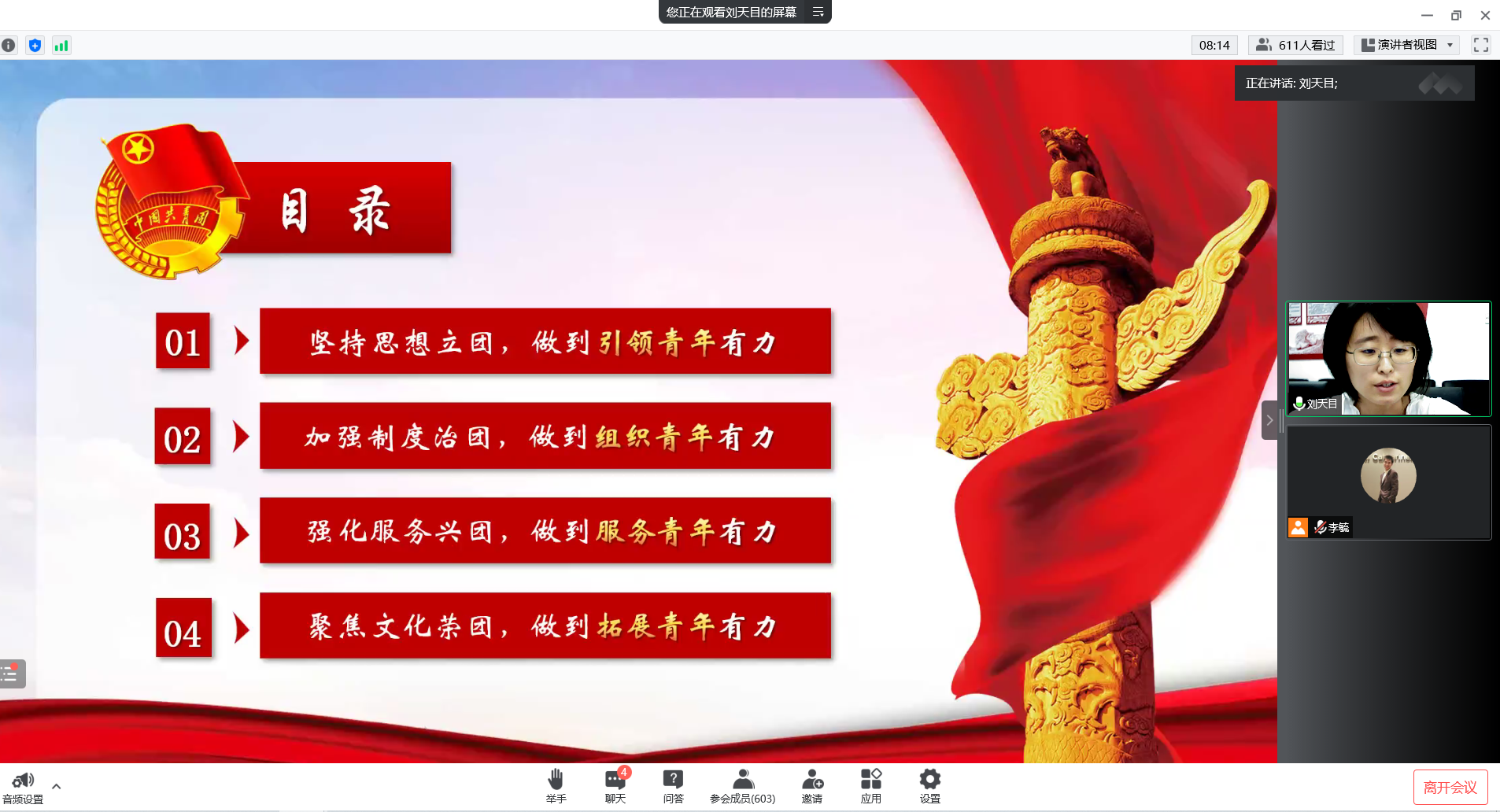 为加强2022级新生的共青团团员意识,深化共青团情怀,增进对党和团的认识,吉林大学商学与管理学院团委书记刘天目老师于2022年8月30日通过腾讯会议为2022级新生举办了“以青春之名,续写时代华章”的线上主题团课活动。