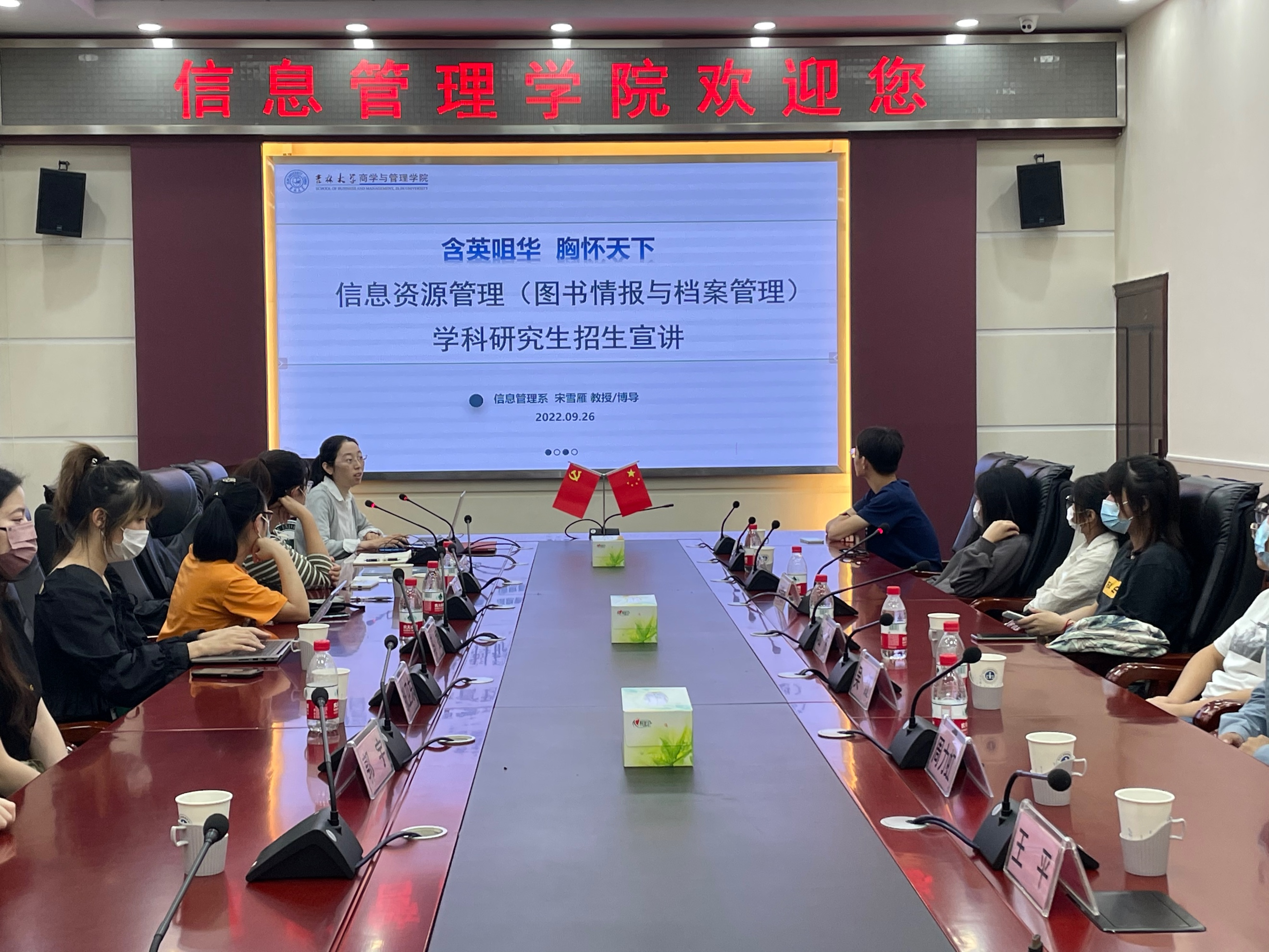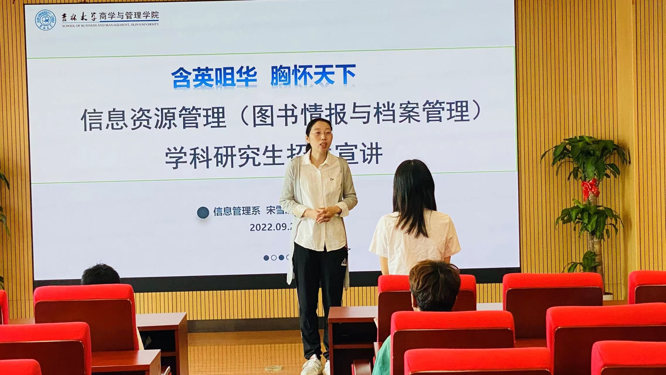 2022年9月26-29日,吉林大学商学与管理学院图书情报与档案管理学科为保障我院研究生招生宣传工作顺利开展,根据当前疫情防控形势,线上线下同步推进,由邓君教授和宋雪雁教授深入武汉大学、华中师范大学、南京大学、南京理工大学、南京农业大学两省五所高校进行招生宣传,详细介绍了我院图书情报与档案管理学科的发展历史、学科构成与研究生培养方向、师资与导师情况、科学研究情况、平台基础建设情况、研究生成果、获奖与奖学金情况、就业与升学情况以及丰富且有意义的各种研究生活动,为现场师生们进行我校研究生招生政策的解读,发放电子招生宣传册,并对学生们所提出的问题均一一作出耐心而专业的解答,获得现场及线上师生的广泛好评。我院图书情报与档案管理学科是全国最早建系和招收研究生的院校之一、全国最早独立招收情报学博士生的3所高校之一、全国最早拥有图书情报与档案管理一级学科博士学位授予权的6所高校之一,也是东北三省唯一具有图书情报与档案管理一级学科博士学位授予权的高校,本学科拥有一支梯队结构合理、科研实力较为雄厚的师资队伍,在十三五以来取得了丰硕的研究成果。在现场宣讲过程中,我院图书情报与档案管理学科的发展历史与科研成绩,对各高校学子产生了较强的吸引力,有利于吸引优秀生源报考。未来,图书情报与档案管理学科研究生招生小组将继续深入到不同地区不同高校,为研究生招生工作构筑坚实基础,吸引更多的优秀学生报考。