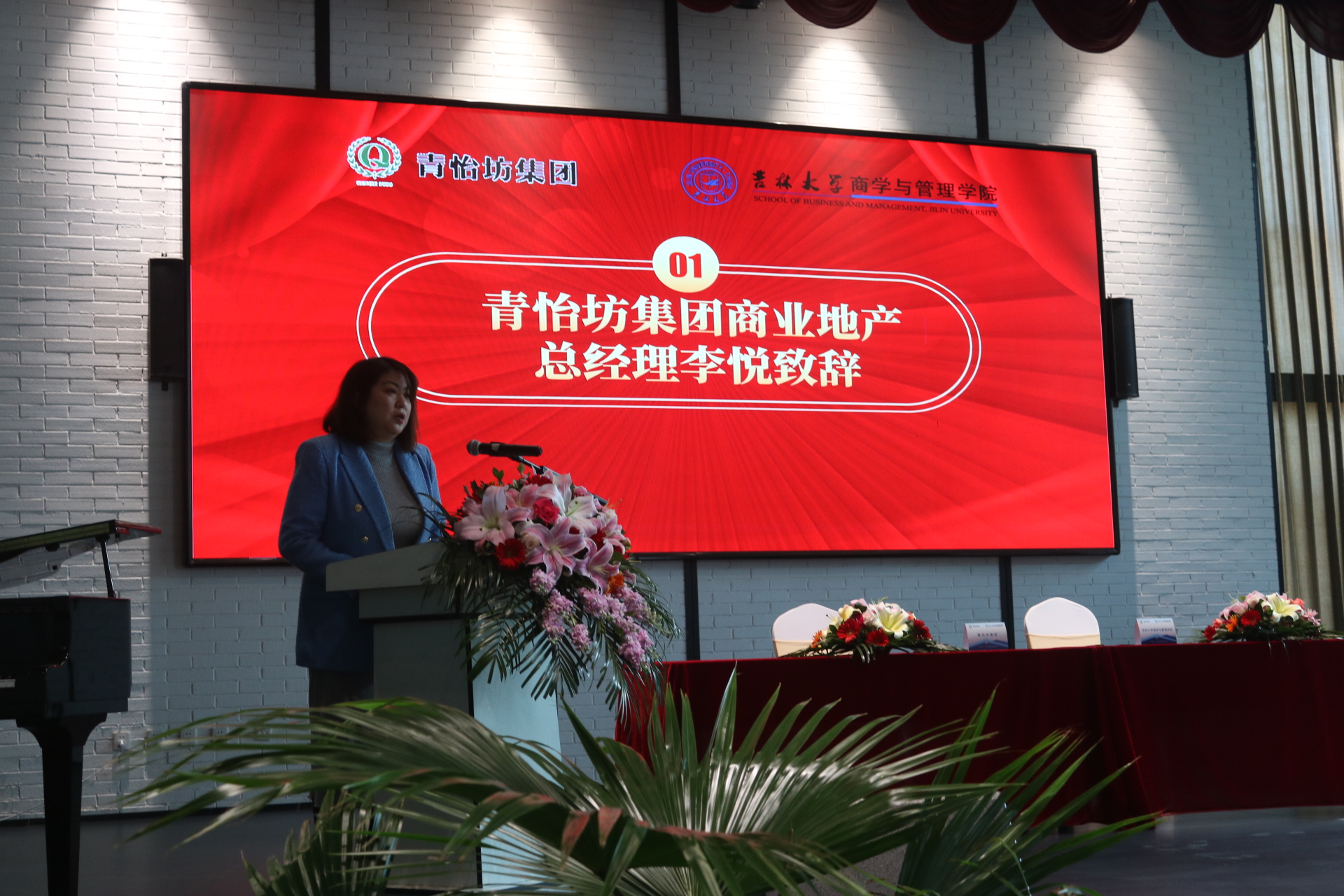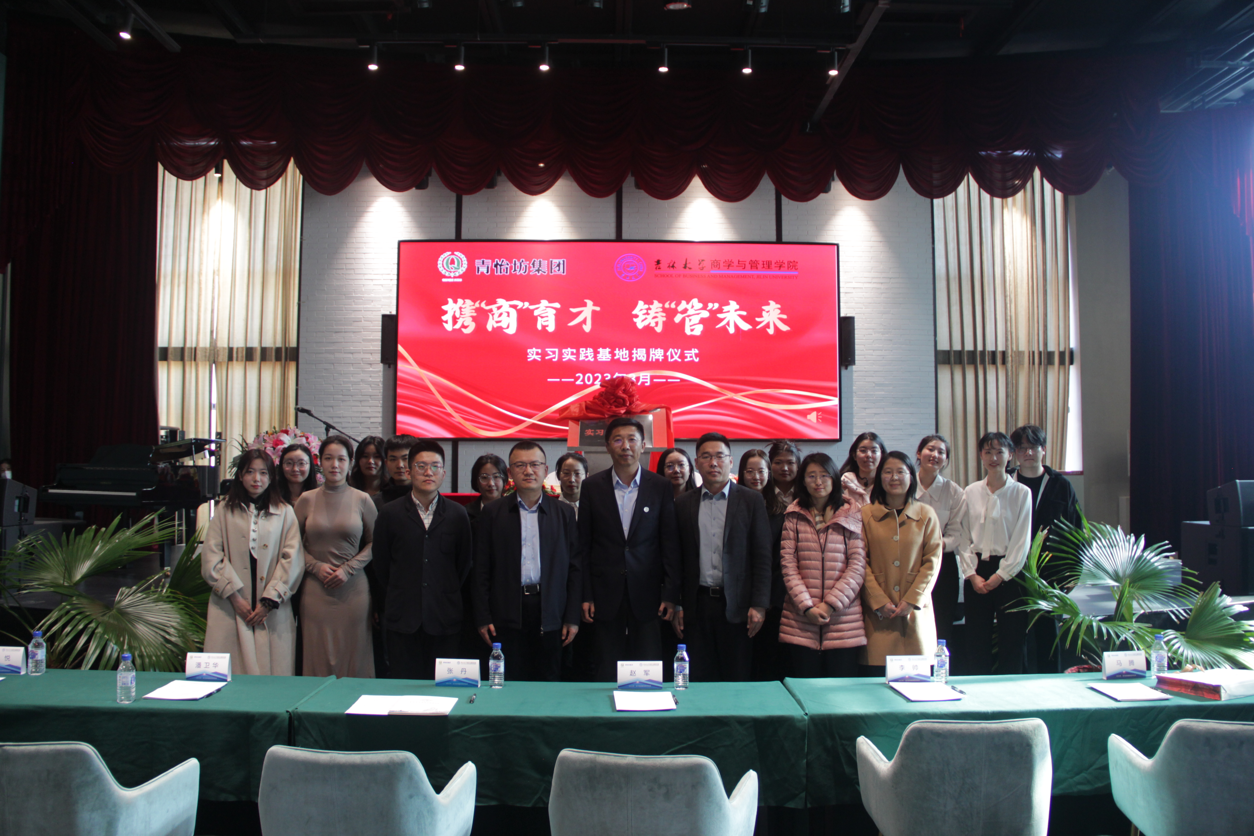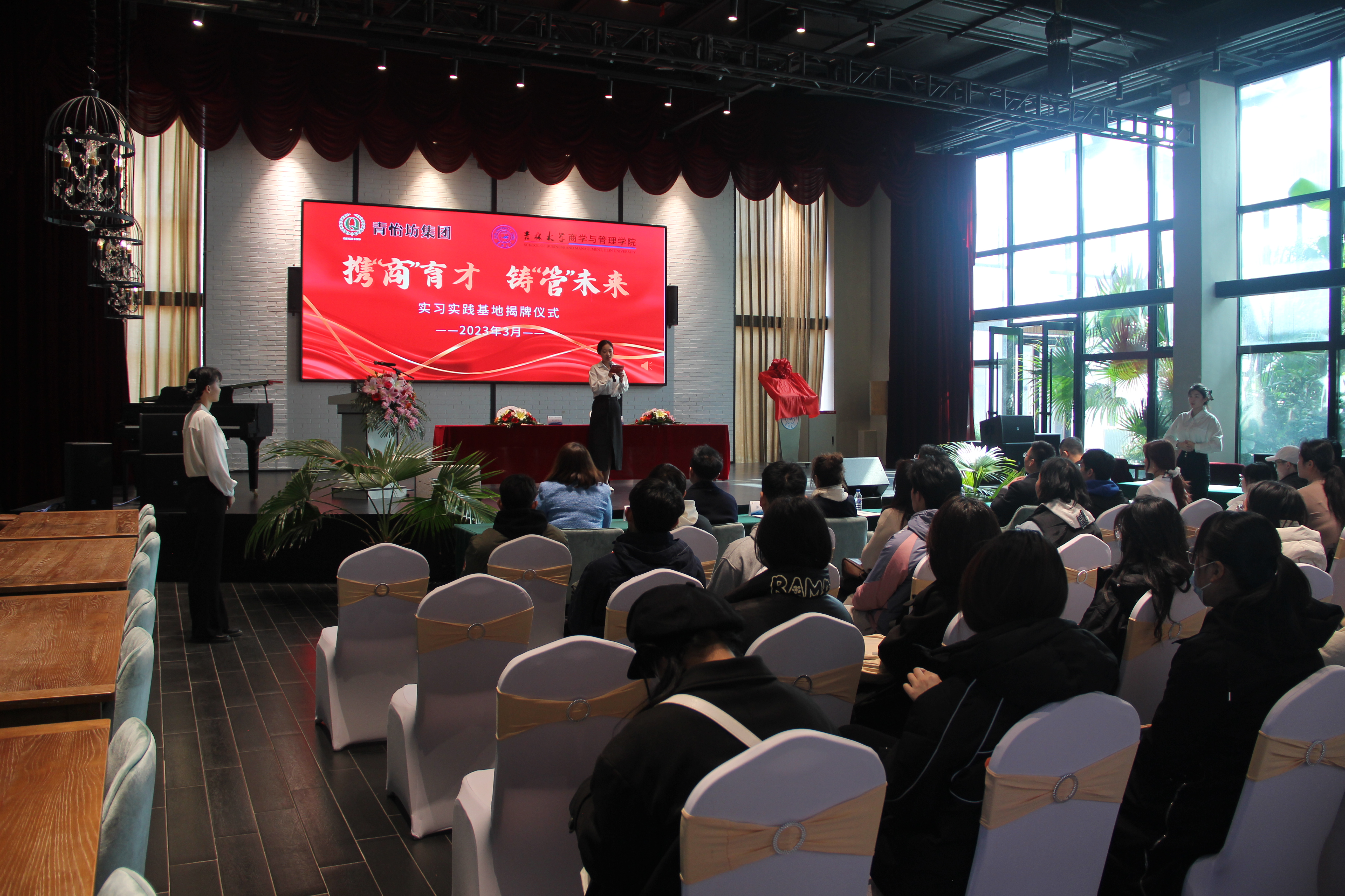 为深入学习宣传贯彻党的二十大精神,落实学校“引领工程”争先行动,着力加强学生实践育人工作,促进毕业生更高质量就业,3月17日下午,商学与管理学院和青怡坊集团合作共建实习实践基地揭牌仪式在青怡坊集团雲琅艺术中心举行。青怡坊集团董事长张丹、商学与管理学院党委书记赵军、党委副书记兼副院长李帅、党委副书记马腾、青怡坊集团商业地产总经理李悦、商业公司总裁潘卫华以及辅导员和部分学生代表出席了本次揭牌仪式。