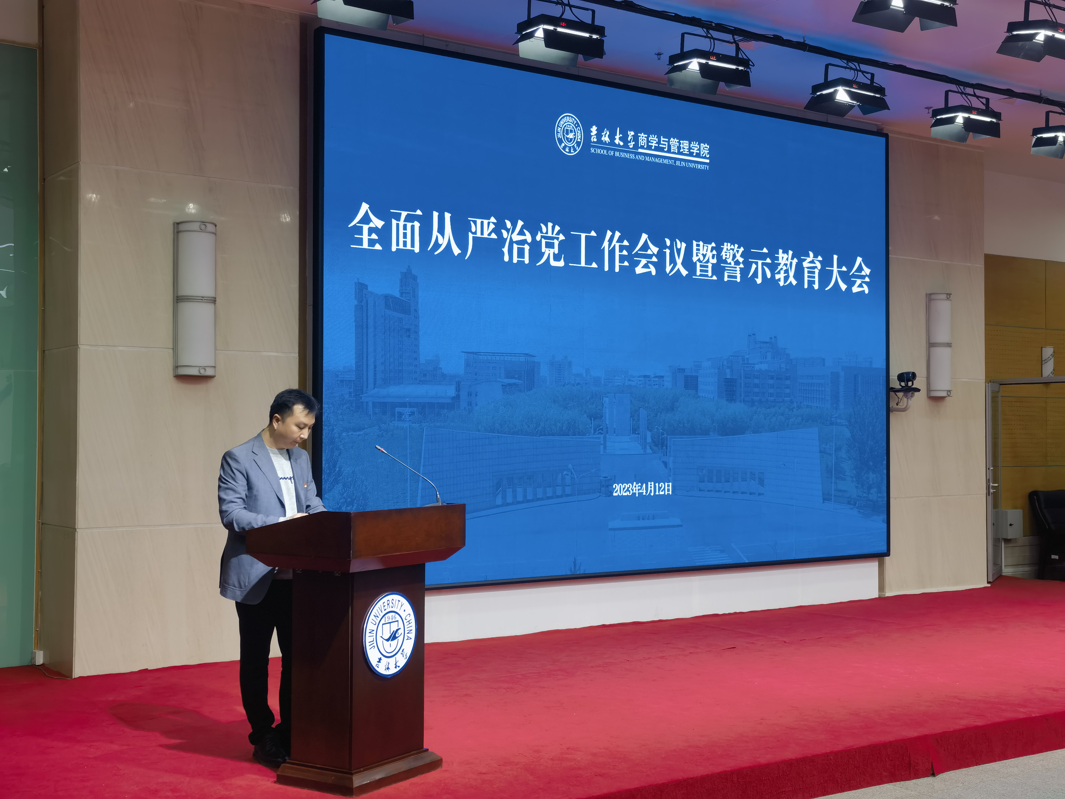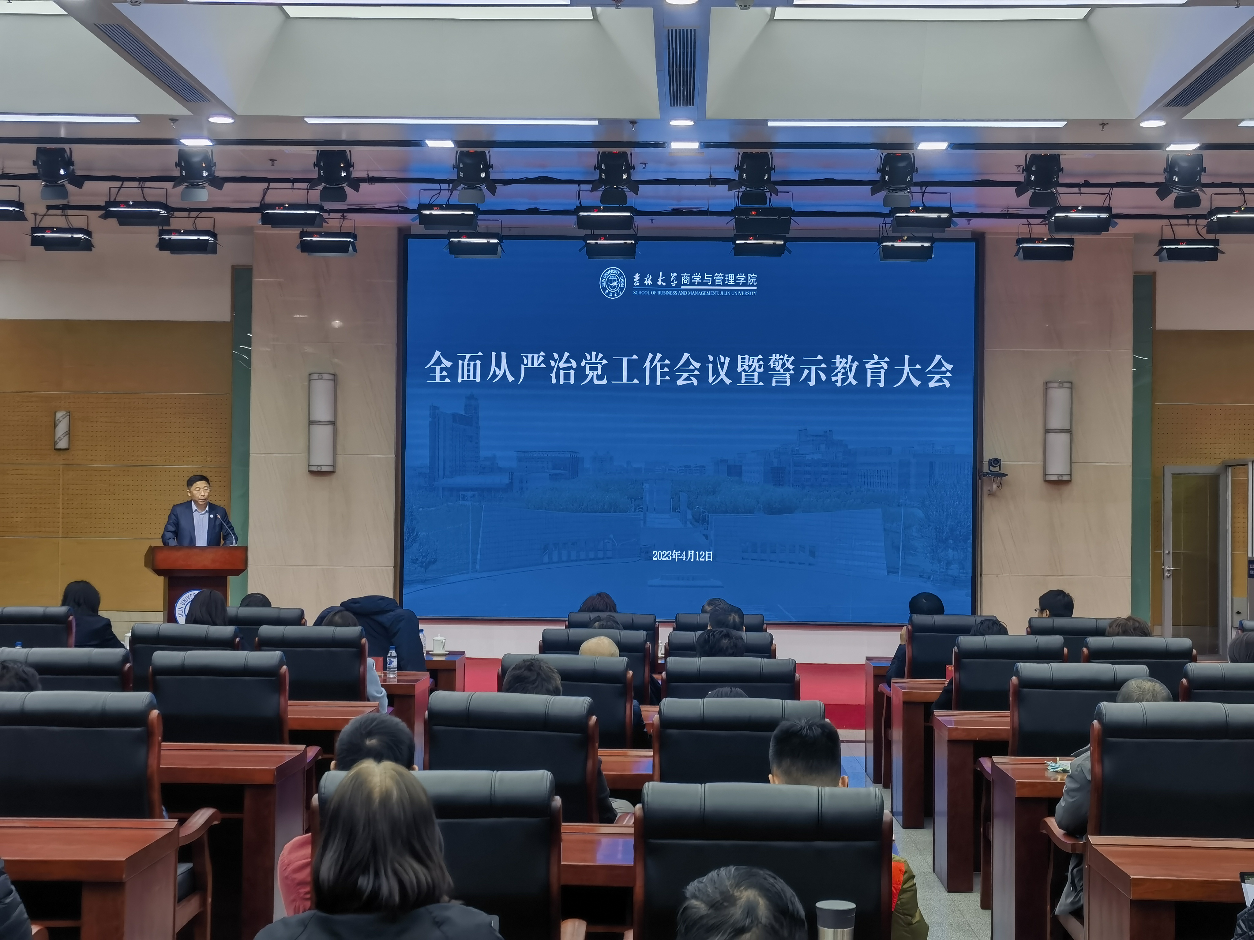 2023年4月12日下午,商学与管理学院在东荣会议中心第二多功能厅召开全面从严治党工作会议暨警示教育大会。学院领导班子成员、党委委员、纪委委员,各系、中心主任,各行政科室主要负责人,教工党支部书记参加了本次会议。会议由学院党委书记赵军主持。