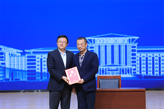 蔡立东校长为悦读会题词“悦读润心 事业养生”,并向首期分享嘉宾屈东明颁发校外合作导师聘书。