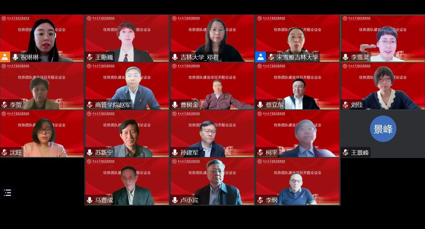 5月8日上午,商学与管理学院优势团队建设计划项目团队“数智驱动的信息资源服务体系重构及知识体系建构研究”开题论证会以线上会议方式召开。来自武汉大学、南京大学、南开大学、中国人民大学、中山大学、吉林大学等国内著名高校的专家学者齐聚云端,共同研讨信息资源服务体系等科学问题。吉林大学党委常委、副校长兼商学与管理学院院长蔡立东教授出席开幕式并致辞,商学与管理学院党委书记赵军教授出席开幕式,开幕式由吉林大学商学与管理学院副院长李雪灵教授主持。