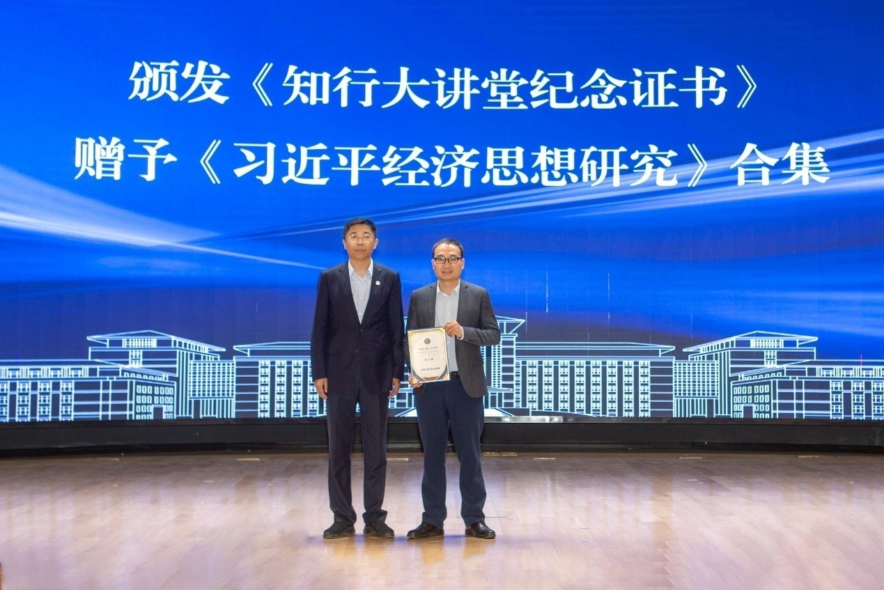 商学与管理学院党委书记赵军为黄卫挺副主任颁发“知行大讲堂纪念证书”。