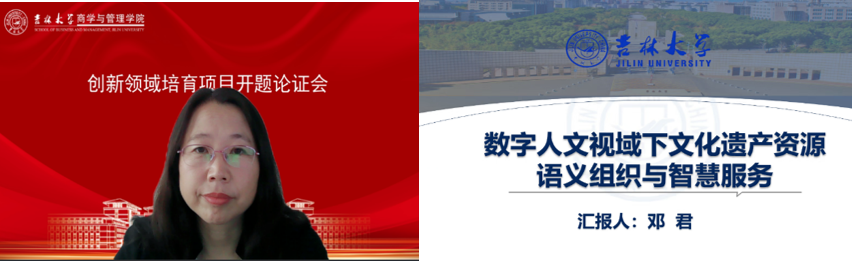 在开题论证环节,由国家级人才、国家社科基金重大项目首席专家、南开大学柯平教授主持。吉林大学商学与管理学院信息管理系主任邓君教授介绍了创新领域培育计划项目“数字人文视域下文化遗产资源语义组织与智慧服务”的宏观、中观、微观研究背景,围绕学术、应用和社会三个层面阐明项目的研究价值,指出该项目对于学院和学科发展的关系和贡献,从理论体系、技术路径、服务体系及场域实证四个维度出发,系统化解构研究框架和总体目标。邓君教授认为,基于数字人文相关理论、数智技术与方法,可以实现细粒度的文化遗产资源语义组织,为后续语义检索、可视化呈现等提供底层数据支持,实现文化遗产的开发式保护以及跨时空传承。