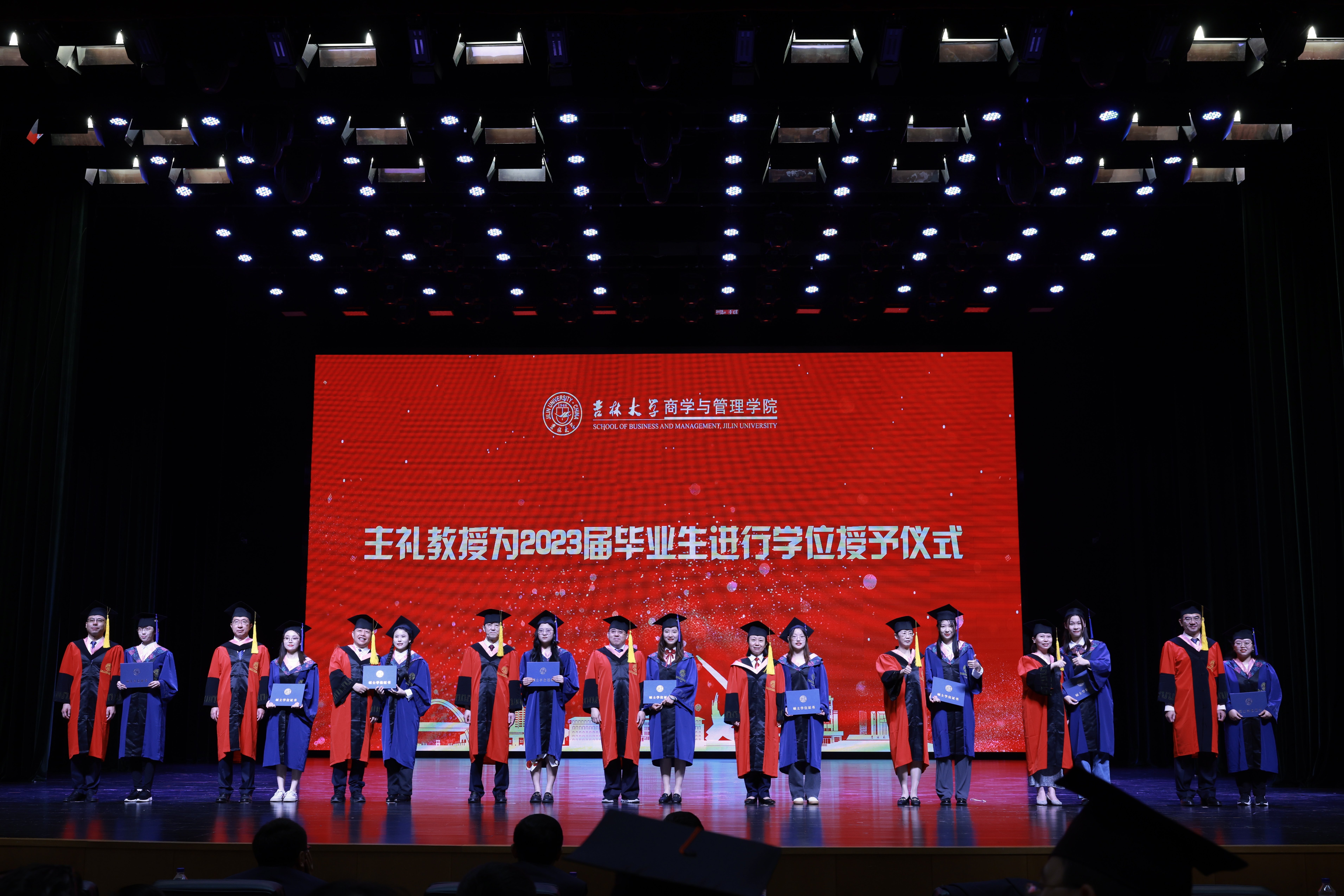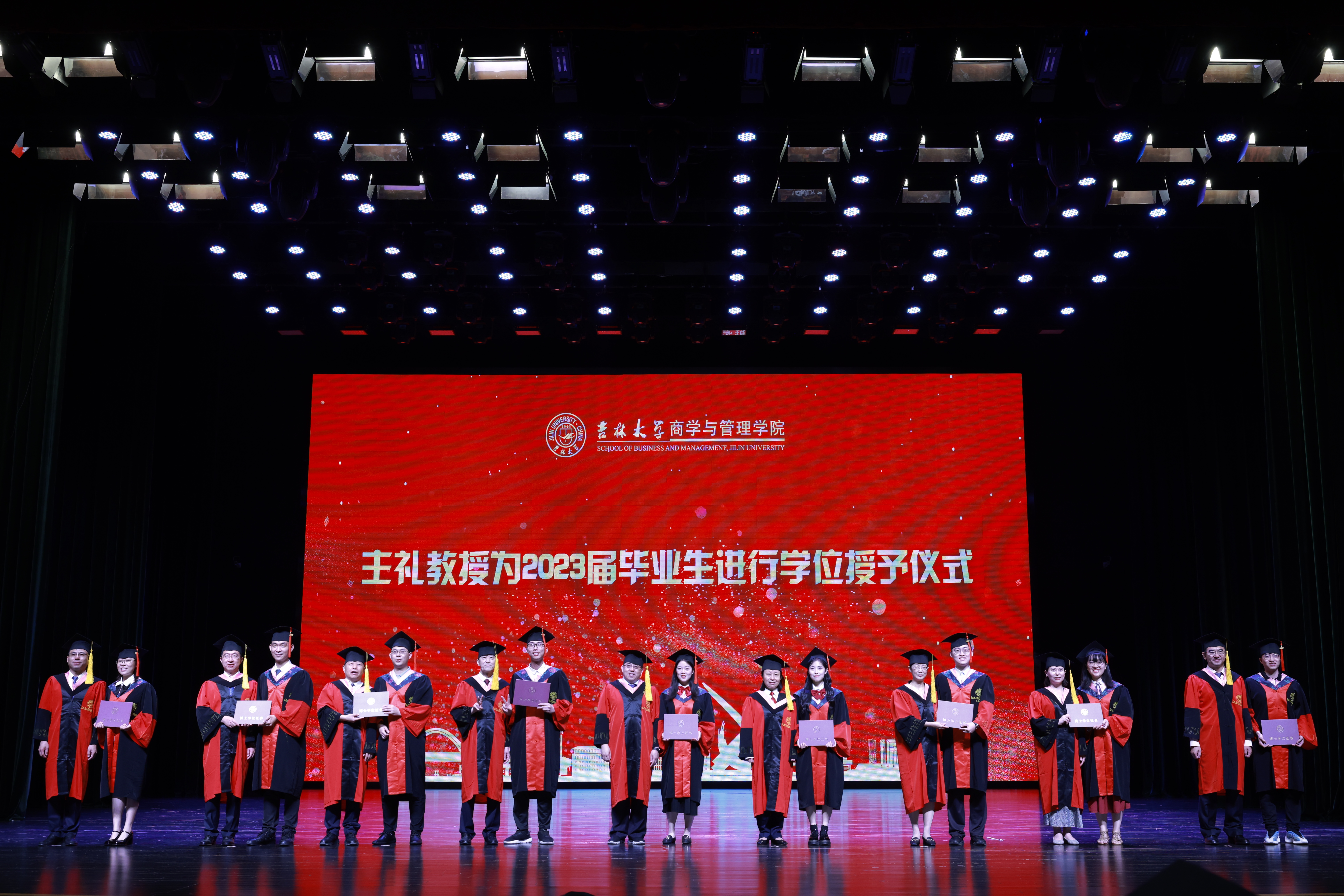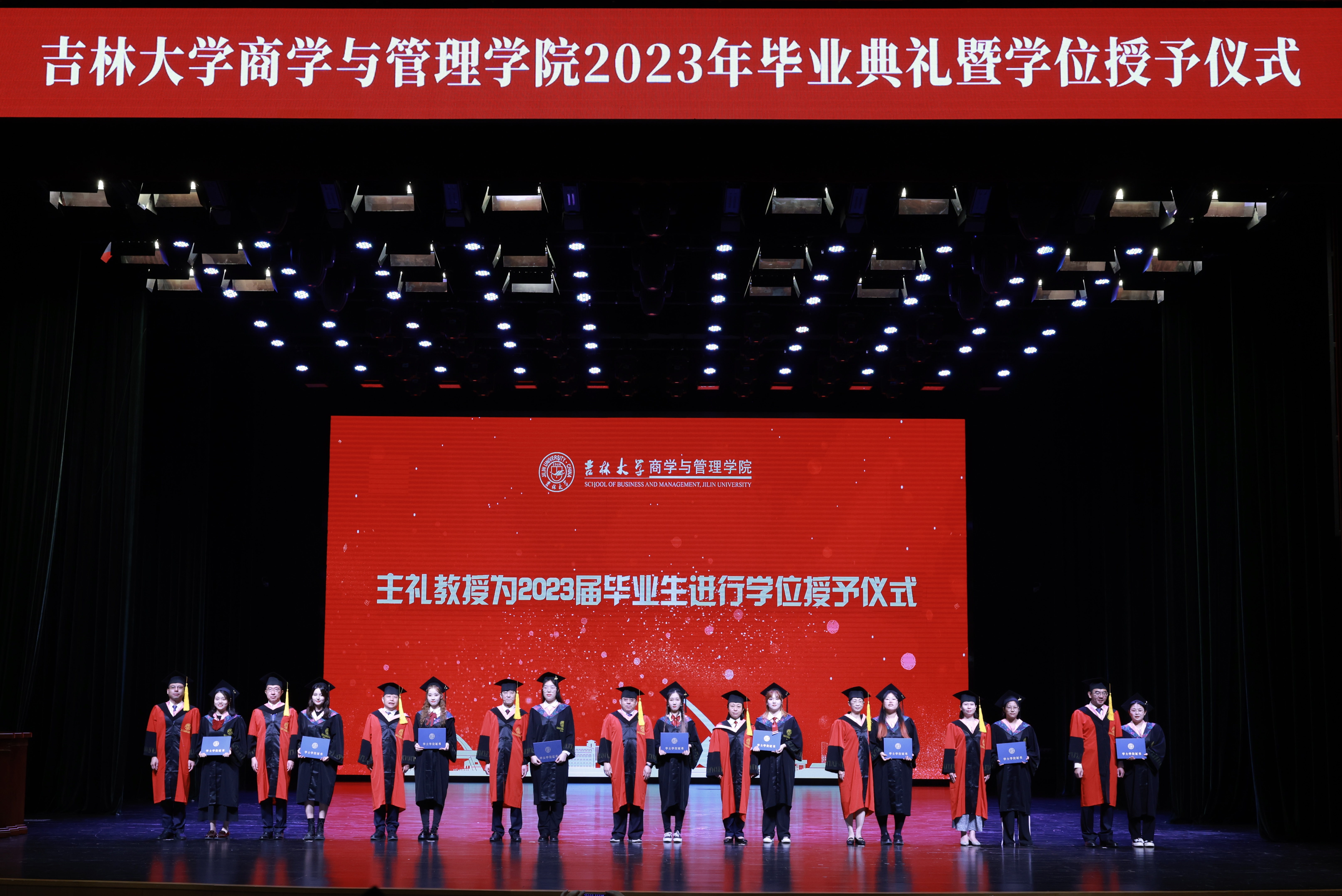 商学与管理学院常务副院长张世伟教授、数量经济研究中心主任孙巍教授、副院长樊雪梅教授、副院长辛本禄教授、副院长郭英彤教授、副院长隋建利教授、副院长李雪灵教授、副院长马捷教授、副院长张公一教授依次为2023届毕业生和2020、2021、2022届毕业生代表授予学位。