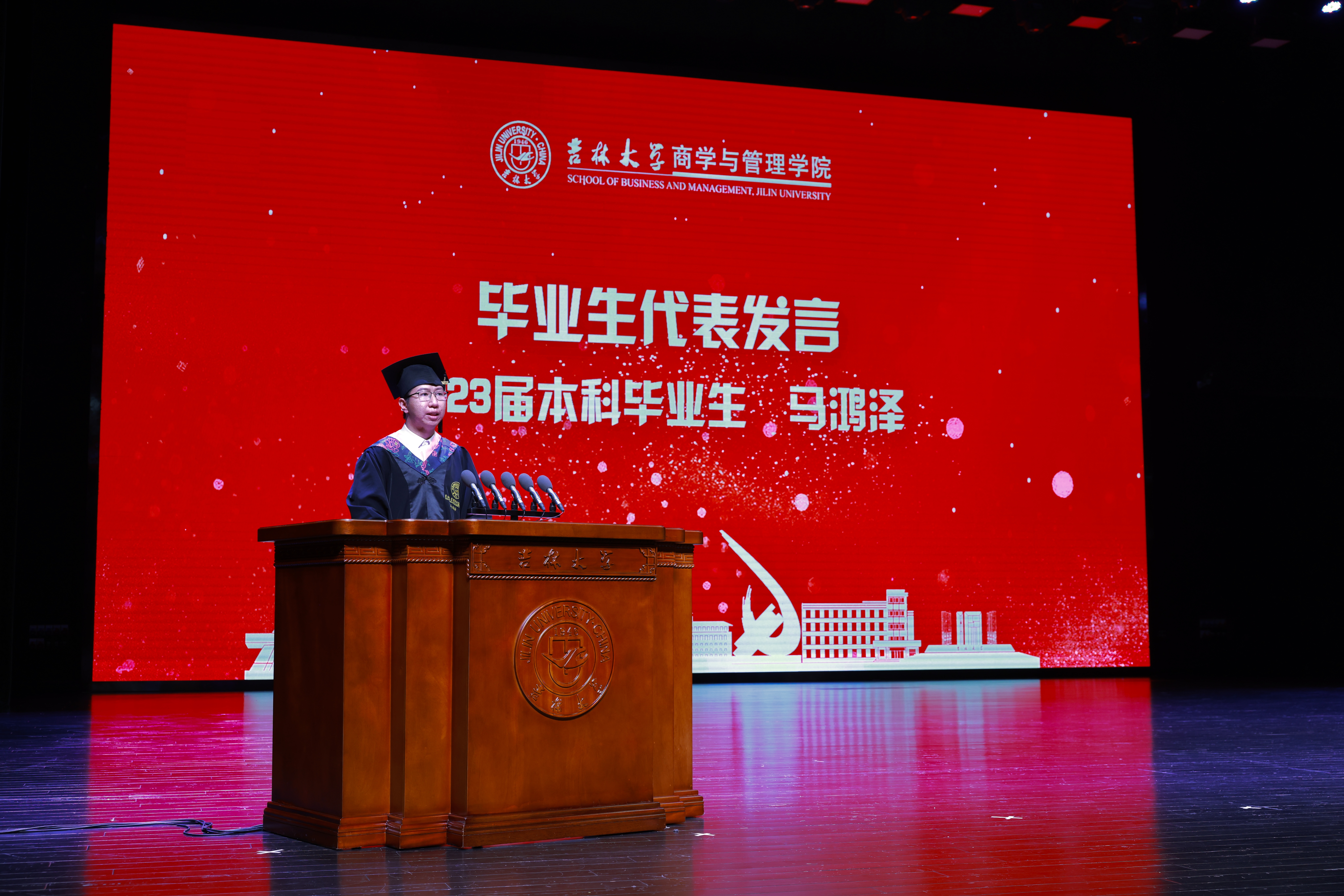 本科毕业生代表、吉林大学十佳大学生、2023届信用管理本科毕业生马鸿泽同学进行了发言。马鸿泽同学特别感谢了母校对自己的培养。身为党员,他强调“红”与“专”是吉大人身上永不磨灭的“根”与“魂”;面对未来,他提出将“求实创新”“励志图强”的吉大精神贯彻到学术与生活中去,潜心贯注创新科研,积极向上规划生活,不负时代,共创未来!