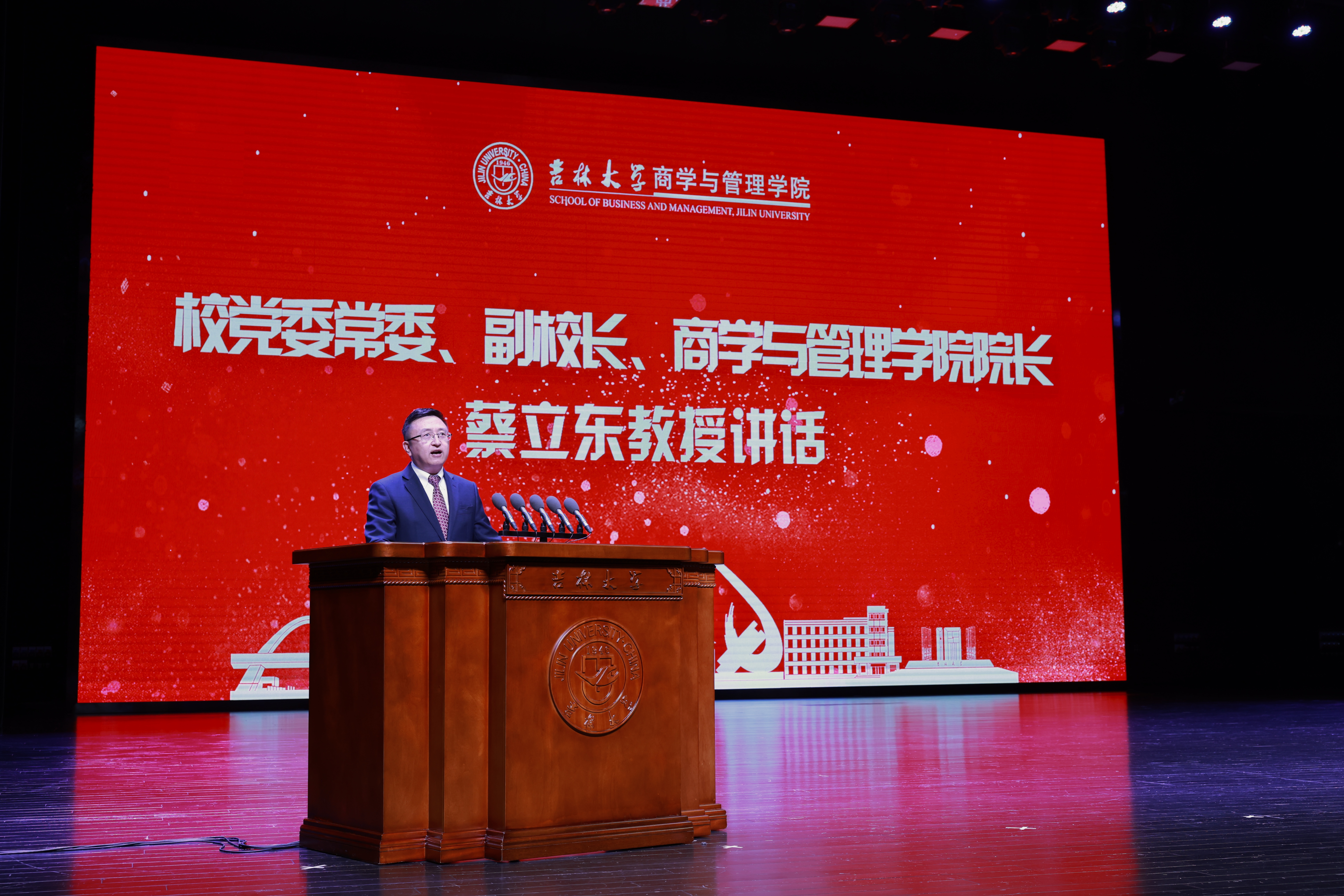 在热烈掌声中,吉林大学党委常委、副校长、商学与管理学院院长蔡立东教授进行了发言。蔡立东院长以“欲达目标,先辨路标”为题,为同学们提出三点期望:第一,要远方有目标,眼前有路标,欲达目标,先辨路标。他警示同学们,人生的每一个目标都需要仔细斟酌,且对于职业的选择并无贵贱,“把平凡的事做到极致就是非凡,把细微的事坚守一生就是伟大”。第二,要瞄准路标,赓续前行,用努力提升能力,坚定迈向人生目标。他勉励同学们以水滴石穿的坚持、日积月累的付出,脚踏实地一步一步走向心中的目标。第三,我思故我在,努力让思考成为存在方式,才能在世间纷扰中真正看清路标。他立足当下的信息化时代背景,告诫同学们需要时刻打磨和自觉坚守独立个体的理性和清醒。最后,蔡立东教授勉励大家守护梦想与初心,以正确的路标为指引,走向更高的山峰,俯瞰更多的风景,无畏远方!