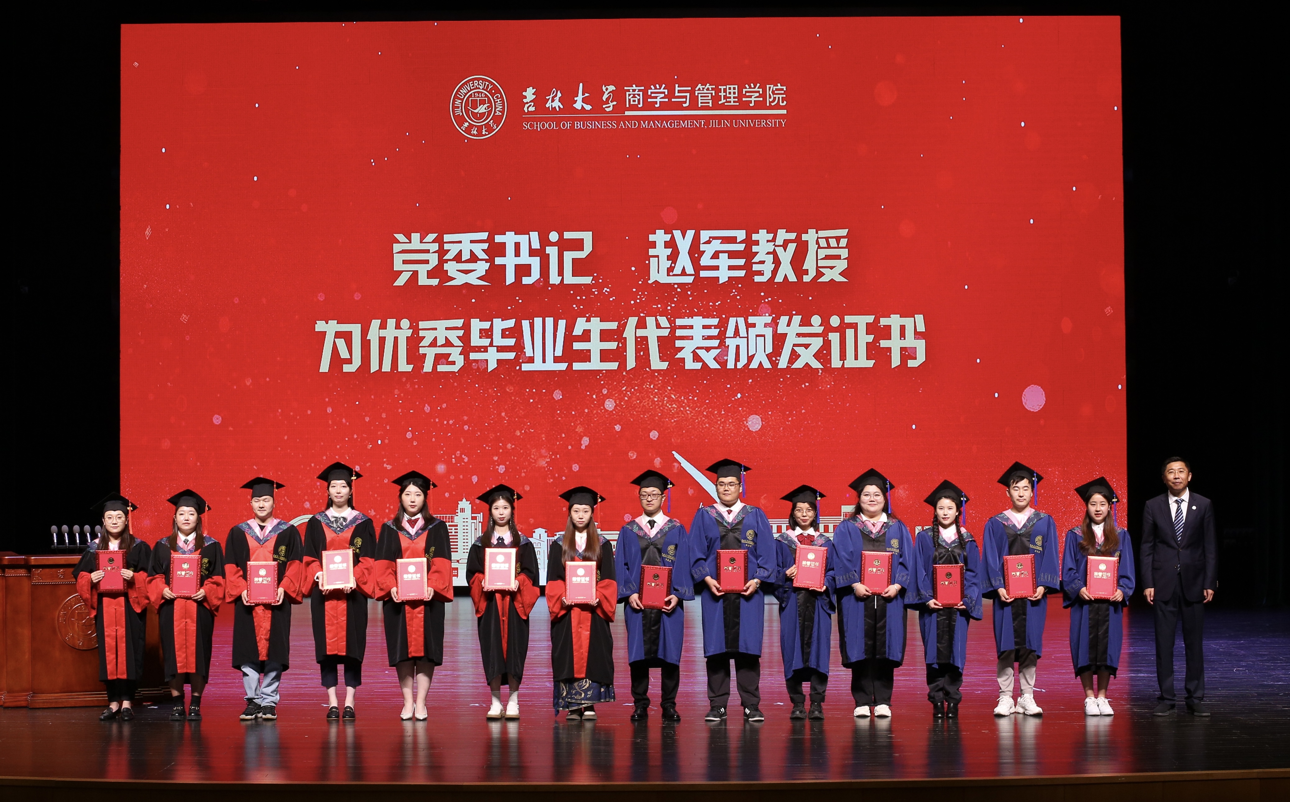 典礼上,商学与管理学院党委副书记兼副院长李帅老师、商学与管理学院党委副书记马腾老师分别宣读了《关于表彰吉林大学商学与管理学院2023届优秀本科毕业生的决定》和《关于表彰吉林大学商学与管理学院2023届优秀毕业研究生的决定》。