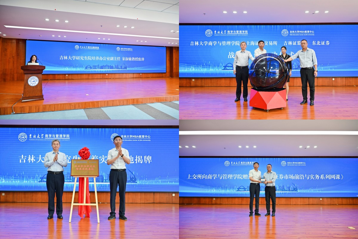 吉林大学商学与管理学院、上海证券交易所、吉林证监局、东北证券股份有限公司战略合作正式启动。吉林大学商学与管理学院党委书记赵军、东北证券总裁何俊岩共同为研究生培养实践基地揭牌。上交所投资者服务部资深经理周翀向学院赠送《大学生证券市场前沿与实务系列网课》。