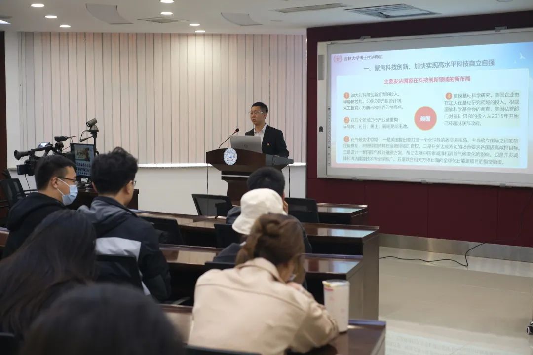 为深入学习宣传贯彻习近平新时代中国特色社会主义思想和全国两会精神,充分发挥博士生讲师团理论宣讲作用,引领广大青年学子学深悟透党的新理念、新思想、新战略,坚定历史自信,坚持守正创新,深刻领悟好、践行好全国两会精神,2023年5月5日,吉林大学博士生讲师团讲师蒋理走进商学与管理学院开展理论宣讲。本次宣讲的主题是“凝聚精神力量 激发使命担当”——以科技创新赋能,推动高质量发展。商学与管理学院党支部党员、中共预备党员、助管、研究生干部参与了本次活动。