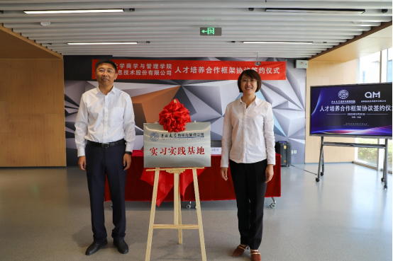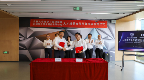 随后,在与会人员的共同见证下,吉林大学商学与管理学院党委书记赵军与启明信息技术股份有限公司董事长许万才代表双方签署“吉林大学商学与管理学院实习实践基地”协议,赵军书记与启明信息技术股份有限公司总经理曲红梅代表双方揭牌。