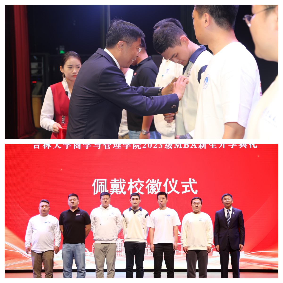 典礼在国歌声中拉开序幕。党委书记赵军教授为2023级MBA新生代表颁发校徽。吉林大学将从各位同学胸前的铭牌刻进每一个2023级MBA学生的心里,今日吉大为你高歌,明日吉大以你为荣!