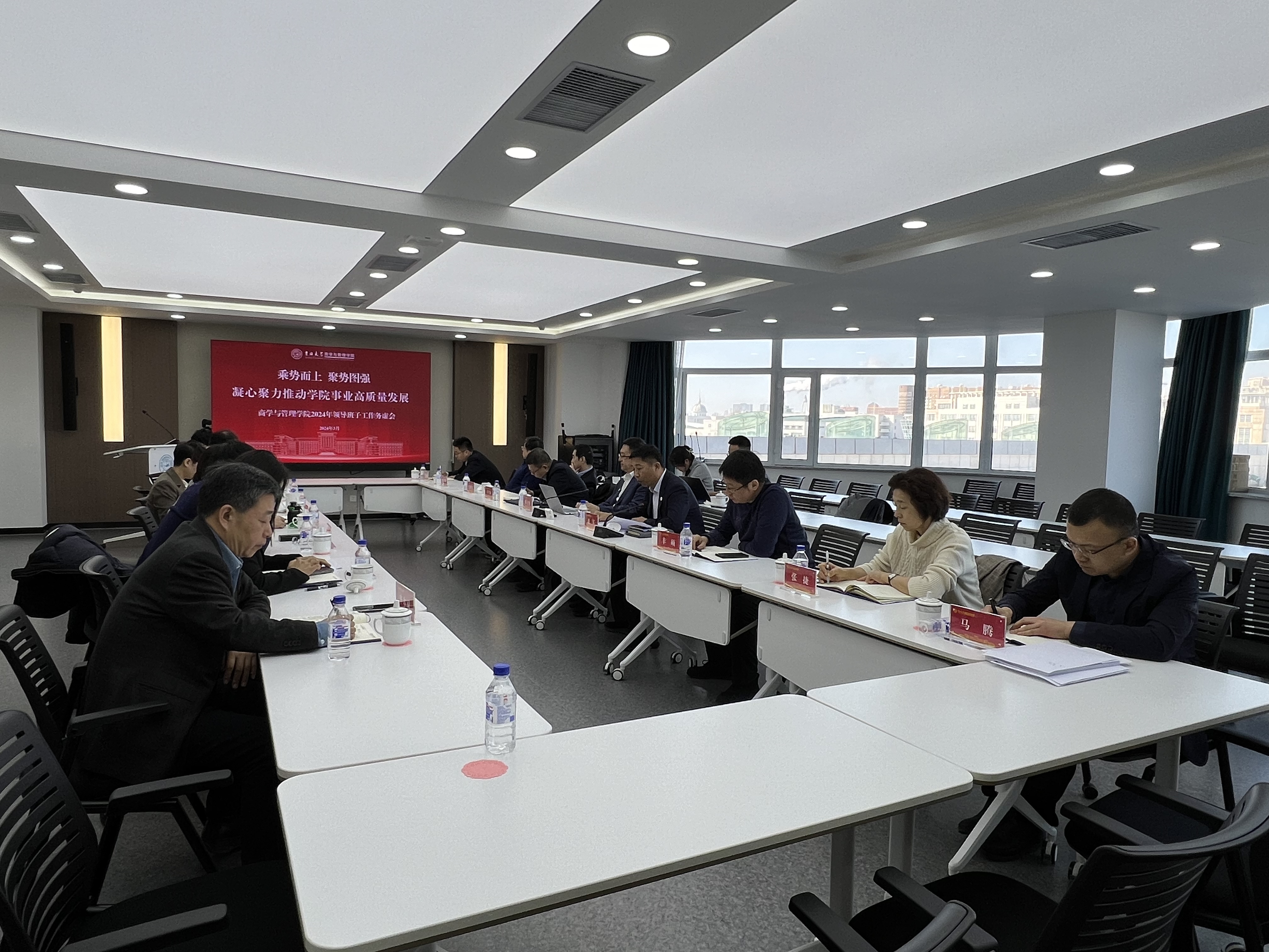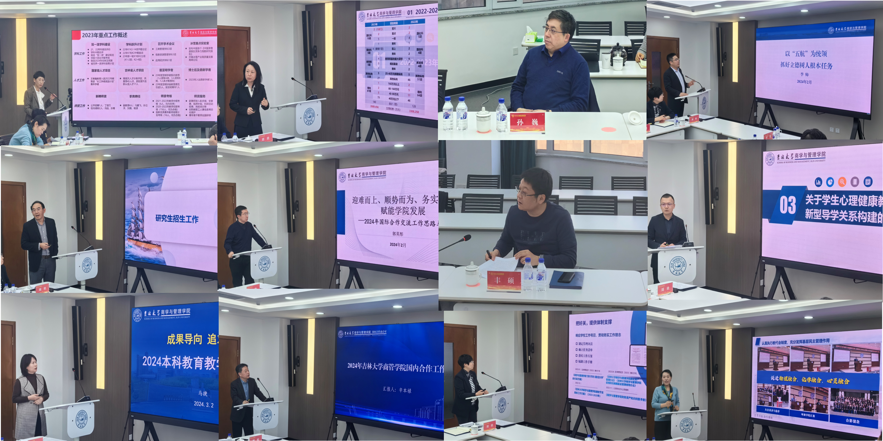 3月2日,商学与管理学院2024年领导班子工作务虚会在东荣大厦506会议室召开。学院领导班子全体成员、学术组织和内设机构负责人代表参加了本次会议。会议由学院党委书记赵军同志主持,学校党建工作联络员卢广林同志到会指导。