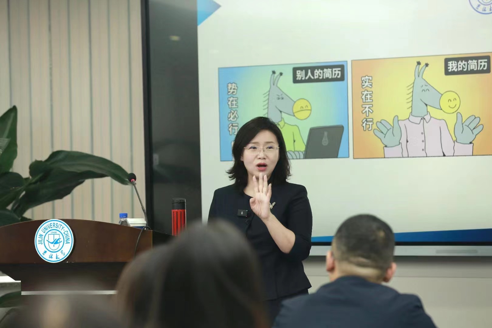 本次系列讲座邀请商学与管理学院副教授苗宏慧老师作为主讲嘉宾。苗老师长期从事战略人力资源管理、人才测评与面试技术职业生涯规划、组织行为学等方面的教学与研究,在本次讲座中,苗老师收集了学院40名不同专业研究生的简历,在讲座之前用大量的时间对其中的问题进行归纳,找出同学们当前的困惑;现场则从简历五星标准、结构慎终如始、“假如我是HR”三个角度进行分享,逐一点评同学们的简历并解答就业疑惑。
