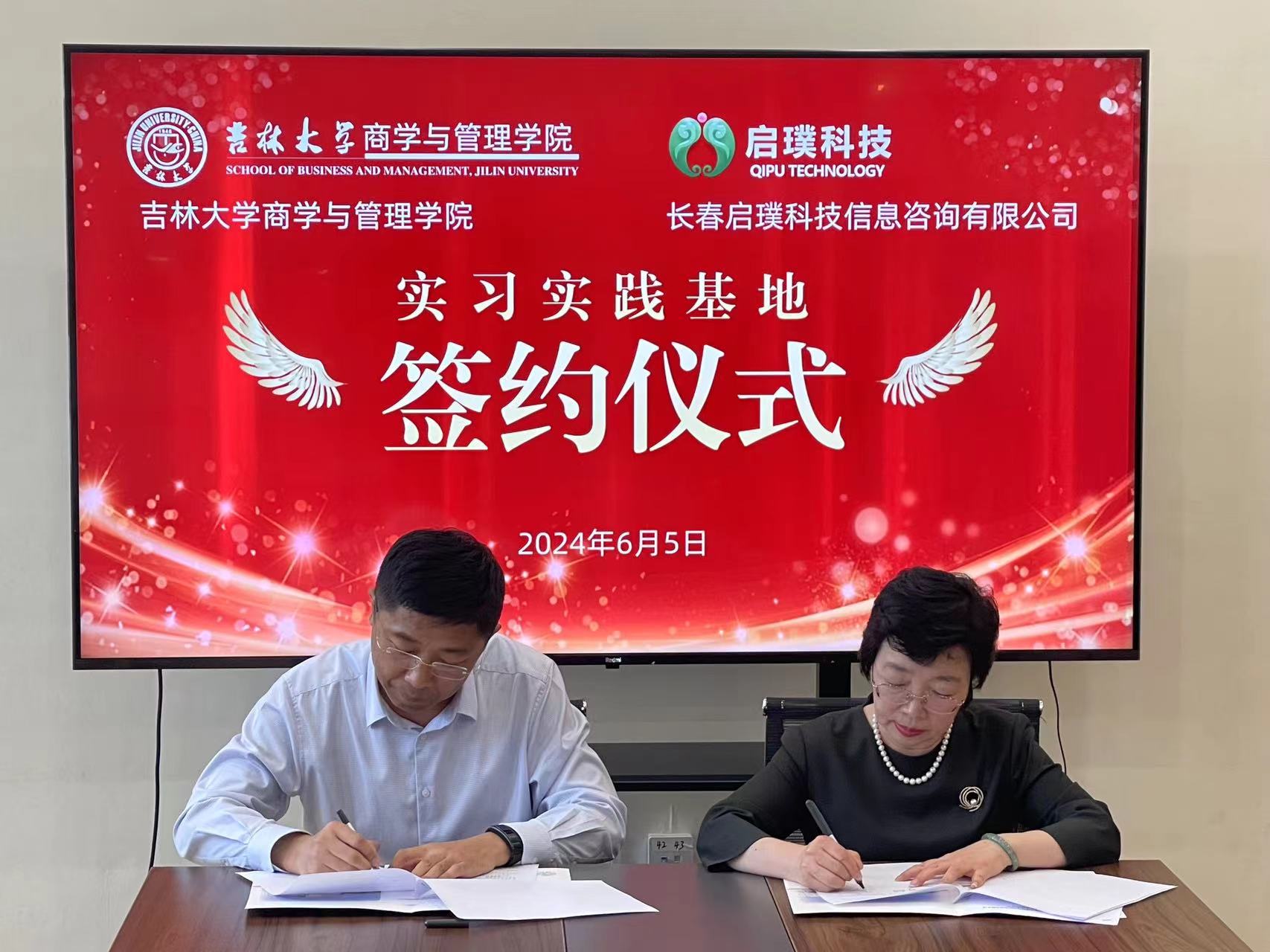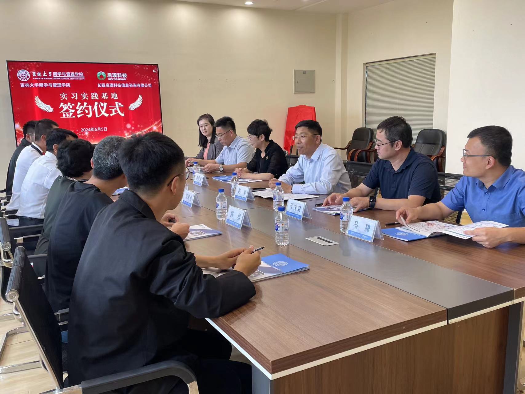 为进一步推动人才培养,加强学院实践育人工作,充分发挥学院科研、学科、人才优势和企业在地域、产业方面的优势,2024年6月5日,吉林大学商学与管理学院和长春启璞科技信息咨询有限公司本着优势互补、互惠互利、互相支持、共同发展的原则,合作设立社会实践基地。长春启璞科技信息咨询有限公司董事长郑淑琼女士、总经理王慧君;商学与管理学院党委书记赵军、党委副书记兼副院长李帅、党委副书记马腾、副院长李雪灵、管理科学与工程系主任于宝君出席活动。