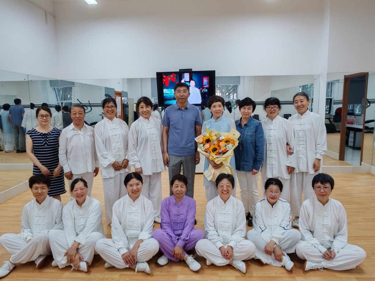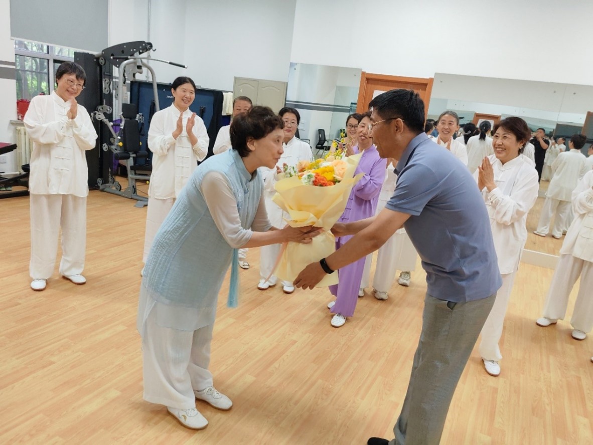 观看了太极拳社团的老师们精彩的太极拳后,党委书记赵军向教练张秋惠老师致以学院的问候。他说,学院的太极拳社团作为教职工的兴趣爱好社团,走过了7年多的时光,学院的教职工们在这里留下了宝贵的集体记忆,在练习拳法中增进了了解,加强了连结,也是商学与管理学院心灵融合工作成效的有力体现。随后,赵军书记代表学院向张秋惠老师献上鲜花,感谢张老师过去7年来对学院文体事业的大力支持。