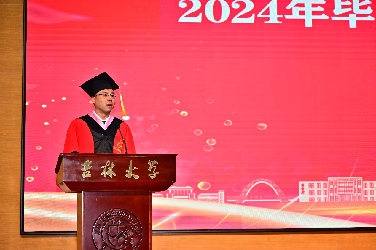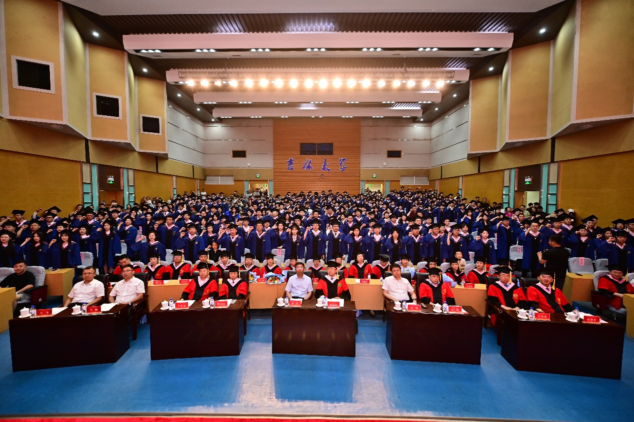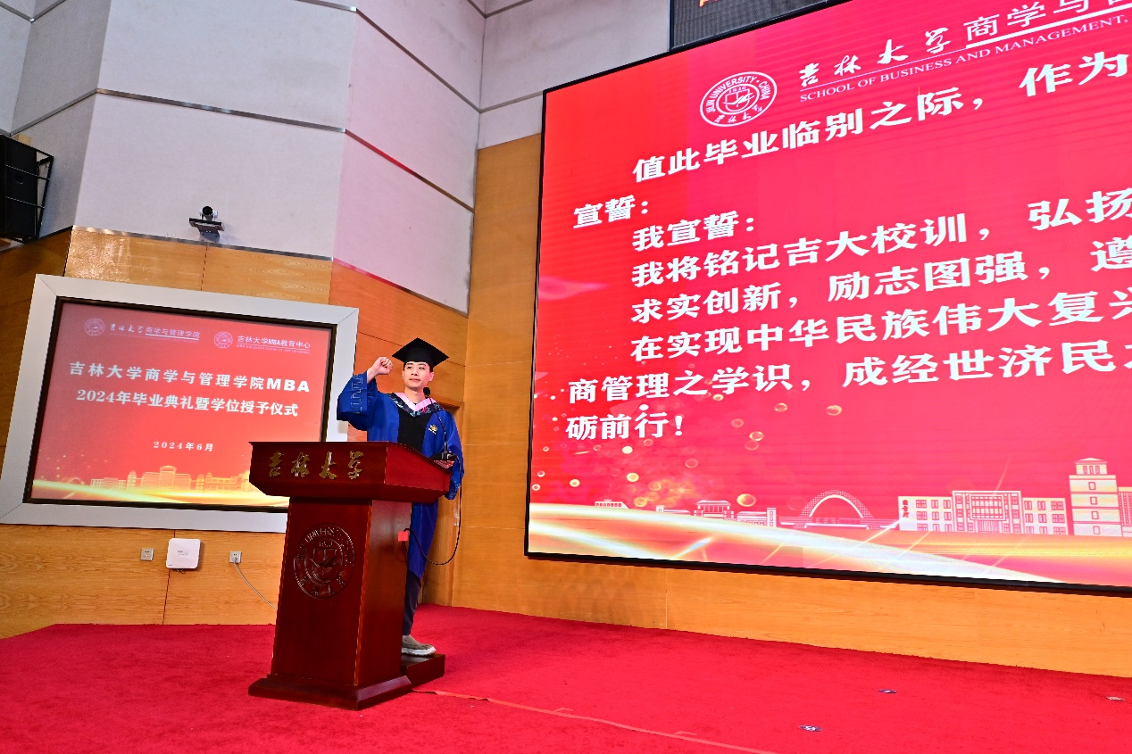 毕业生殷宗楠带领全体毕业生宣誓,承诺将铭记吉大校训,弘扬吉大精神,在实现中华民族伟大复兴的历史征程中,恪守道德,勤勉做事,敢于担当,不负韶华。