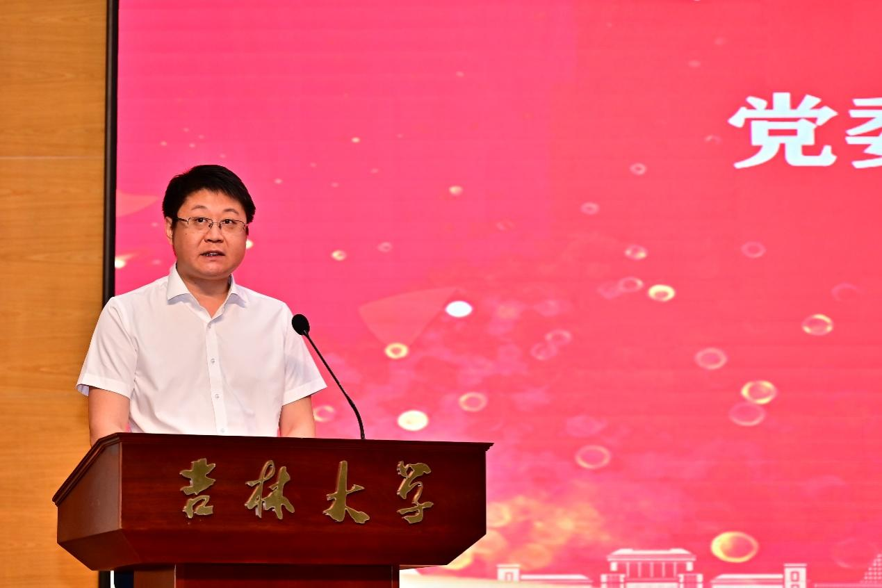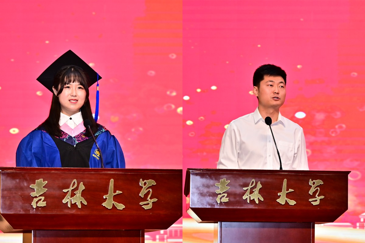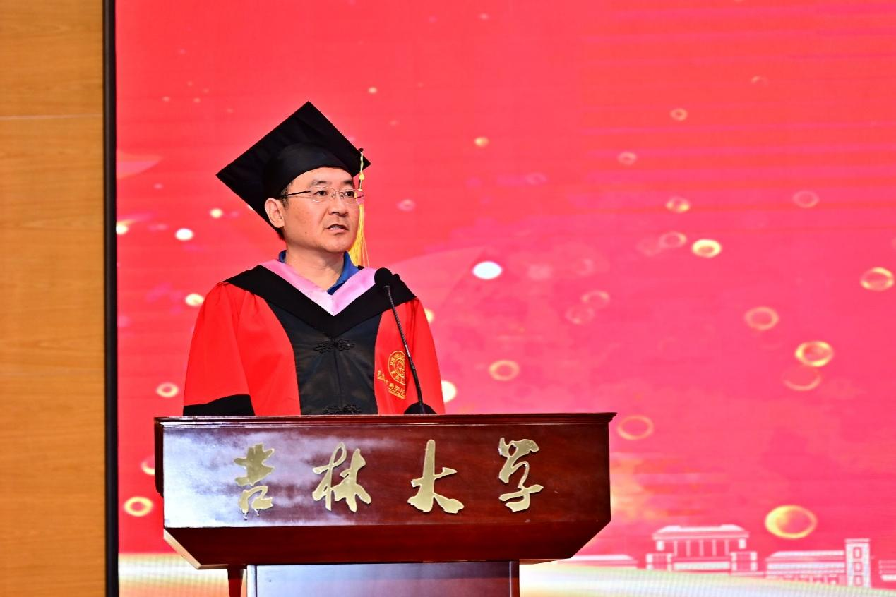 毕业生殷宗楠带领全体毕业生宣誓,承诺将铭记吉大校训,弘扬吉大精神,在实现中华民族伟大复兴的历史征程中,恪守道德,勤勉做事,敢于担当,不负韶华。