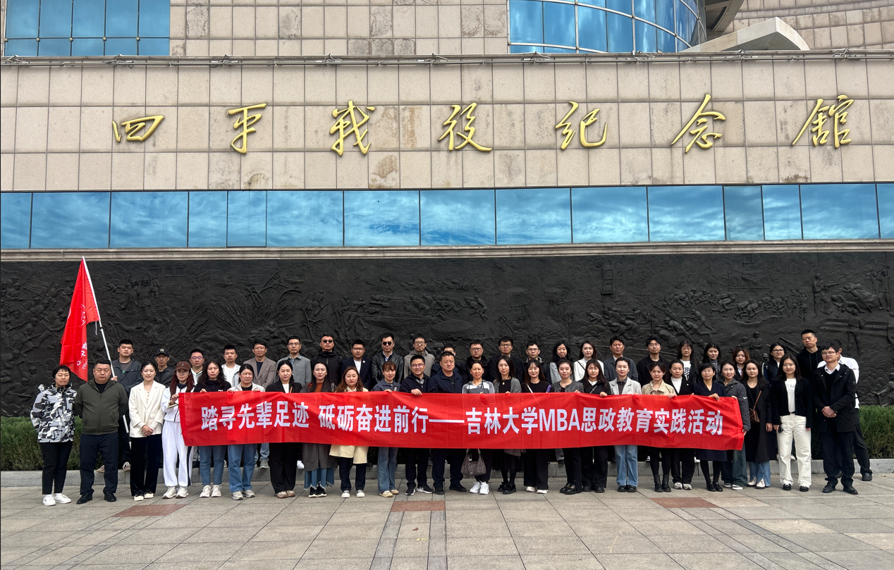 为喜迎祖国75周年华诞,厚植爱国情怀,引导 MBA学生将理论与实际紧密结合,切实提升思政素养,9 月 21 日,吉林大学 MBA 教育中心组织部分 2023 级与 2024 级 MBA 学生前往英雄城四平市,开展了以 “踏寻先辈足迹,砥砺奋进前行” 为主题的MBA+思政教育实践活动。MBA学生事务工作办公室王世强主任、李元凤老师带队参加了活动。活动得到了四平市退役军人事务局的大力支持,四平市人民政府军用饮食供应站王宏安站长、柴美汇主任全程参加了活动。