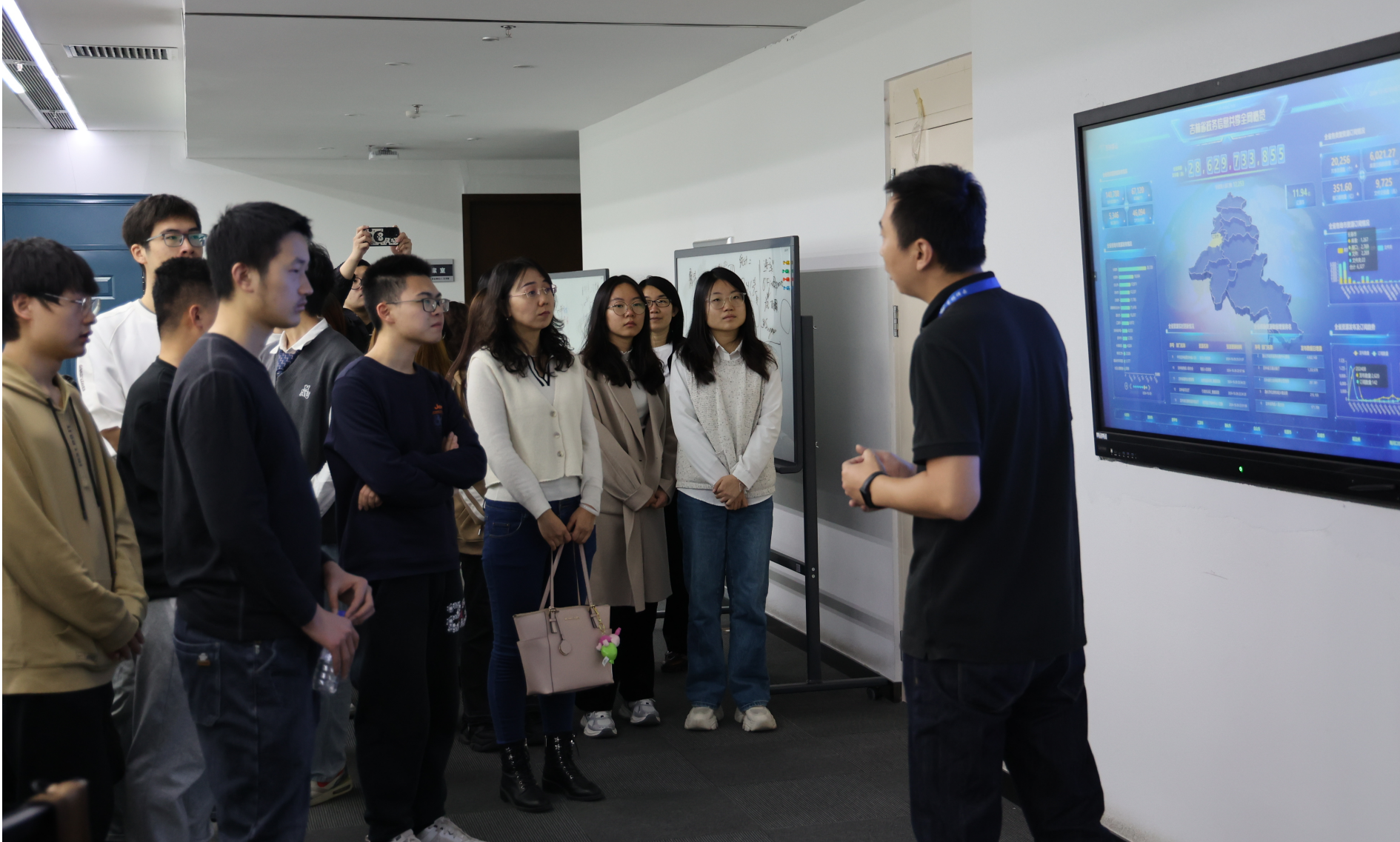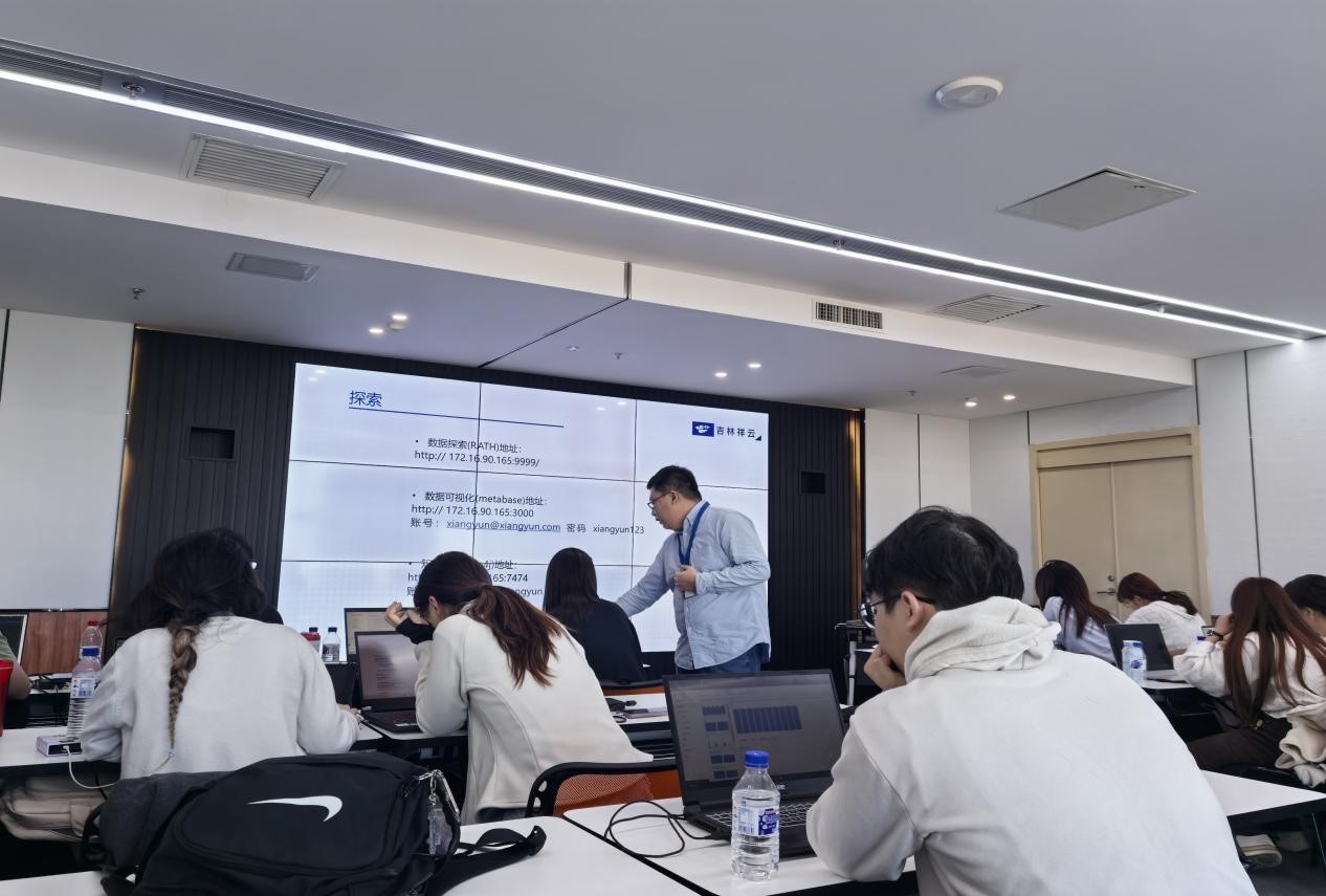 一行人首先学习了自2019年以来祥云公司发展的大事记,详细了解了“吉林祥云”大数据平台、“吉事办”移动端“吉祥码”“祥音”政务大模型等重大项目的推进情况。通过介绍,学生们初步认识到祥云公司在盘活政府数据资源、推动社会数据流通方面所承担的重要使命,以及公司在构建吉林省信息产业健康生态系统、逐步打造成为我国大数据产业在东北地区的集聚中心方面所做出的卓越贡献。