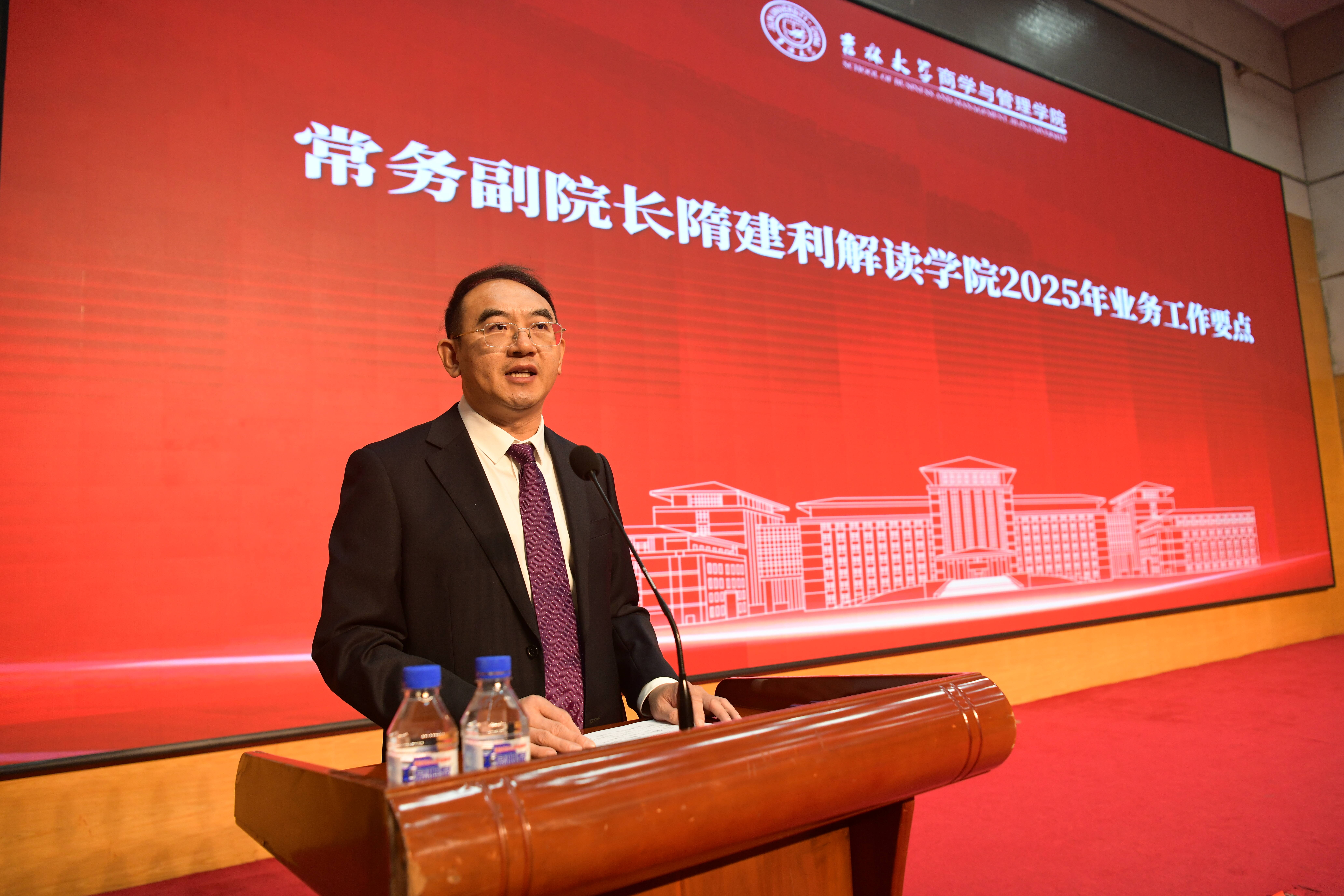 会上,隋建利对2025年学院业务工作要点进行了详细的解读,锚定了学科建设的高质量标准、制定了人才引育的精细化目标、明确了科研创新的突破性方向、提出了对外合作的国际化要求,将学院业务工作要点提炼为“2025年学院十件大事”,鼓舞全体教职工在新征程上再创佳绩。