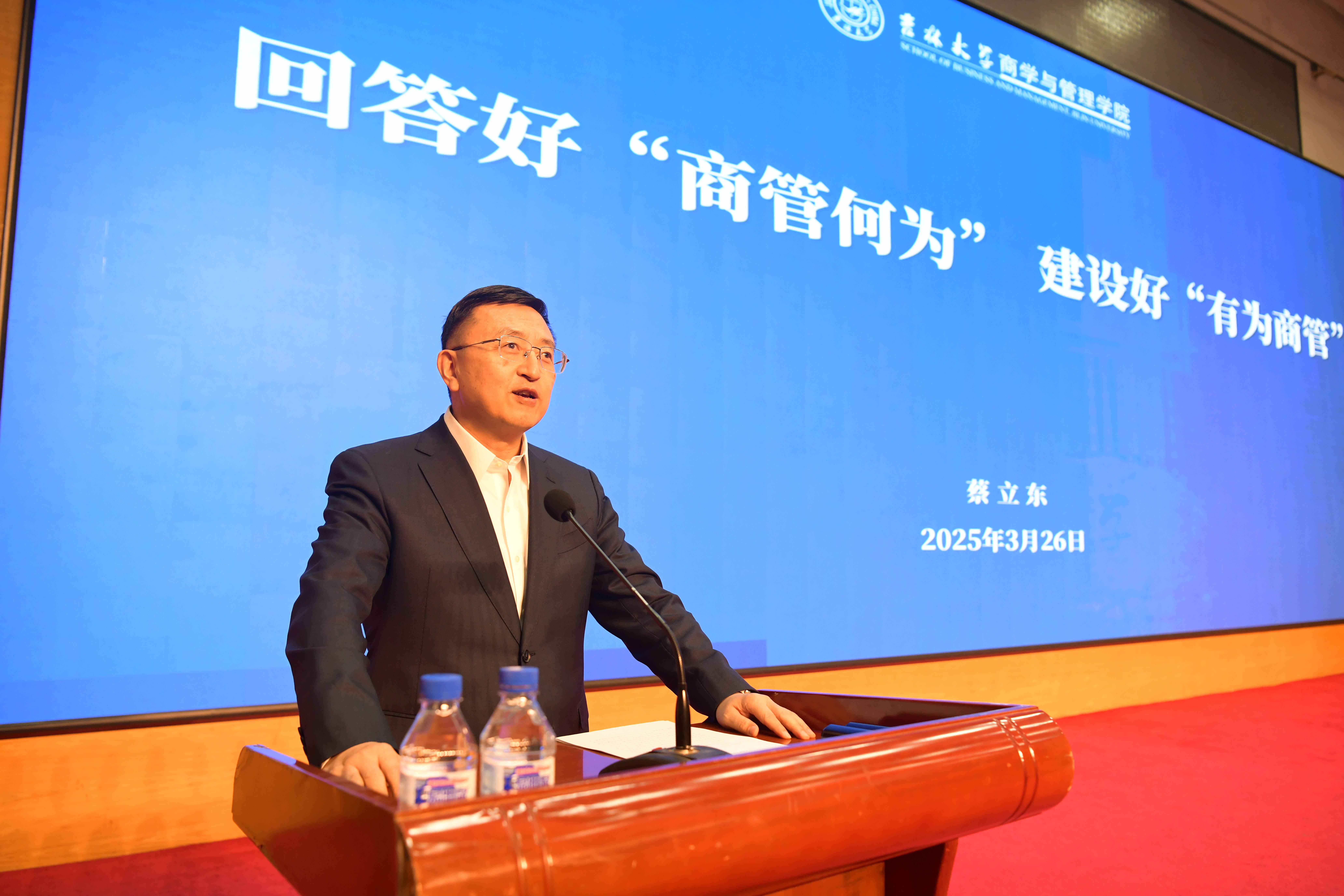 会议最后,校党委常委、常务副校长兼商学与管理学院院长蔡立东教授对会议进行了全面总结。他对学院过去一年取得的成绩给予了充分肯定,对2025年的具体工作进行了强调部署。蔡校长指出:建设“有为商管”需要始终坚定奋斗方向,一马当先“争上游”;需要始终扭住奋斗关键,一以贯之“重合作”;需要始终保持奋斗情怀,一如既往“提士气”;更需要始终紧盯奋斗目标,一丝不苟“促发展”。商管人回首过去,是在用“赶考”之心向历史致敬;商管人展望未来,更是在用“赶考”之行对历史负责。希望全体商管人以“六个坚持”为引领,回答好“商管何为”,以“四个重点”为突破,建设好“有为商管”。