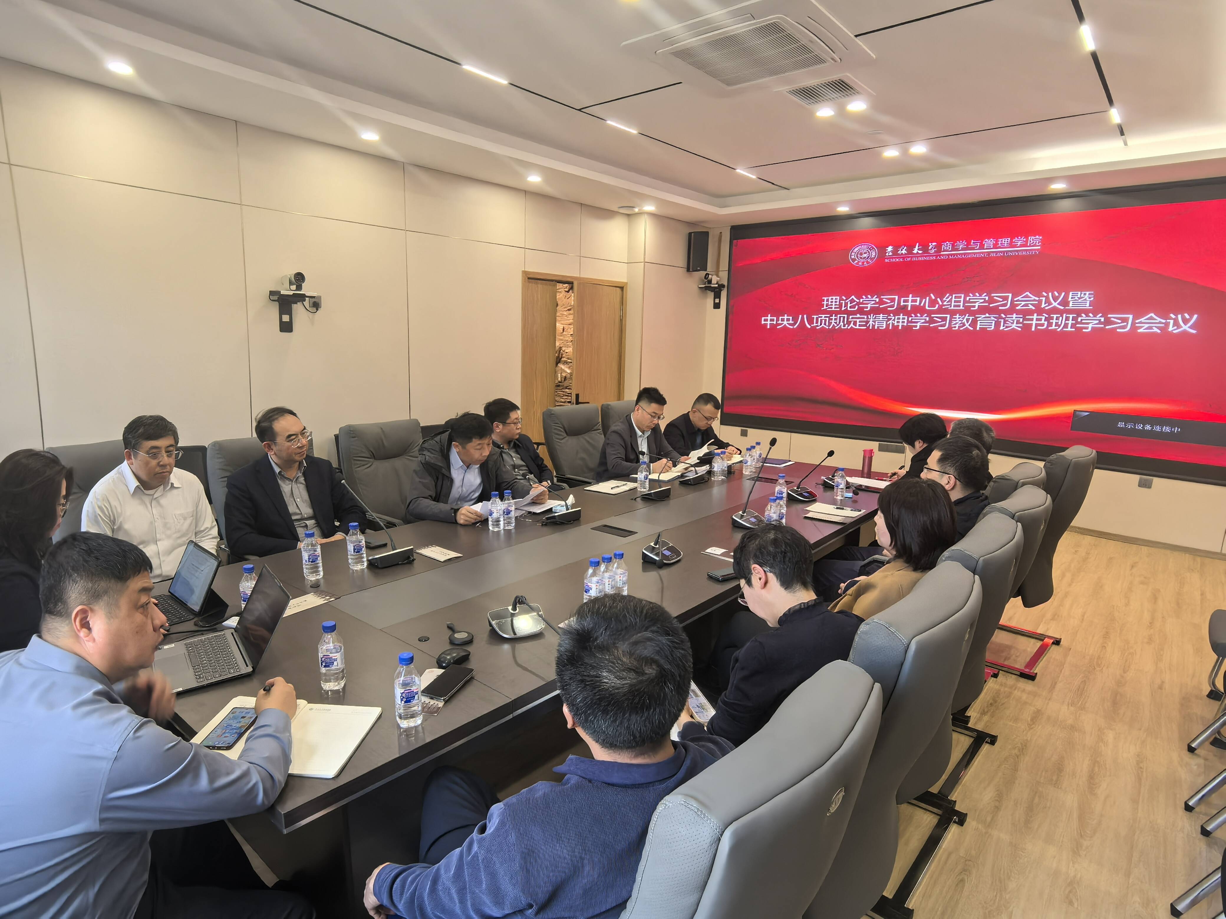 在参观践学之后,商学与管理学院领导班子全体成员在历史名人纪念馆二楼会议室开展了深入贯彻中央八项规定精神学习教育读书班(第二期)暨党委理论学习中心组集体学习会议,会议由党委书记赵军主持。会上,党委理论学习中心组全体成员集体学习了习近平总书记在贵州、云南考察时就学习教育发表的重要讲话精神、《吉林大学贯彻中央八项规定及其实施细则精神的实施办法》。党委副书记李帅、党委副书记兼副院长马腾分别领学了《习近平关于加强党的作风建设论述摘编》中《作风问题核心是党同人民群众的关系问题》《中央八项规定是改进作风的切入口和动员令,是长期有效的铁规矩、硬杠杠》两章内容。领学后,党委理论学习中心组全体成员结合实地践学的所思所想做了分享交流。