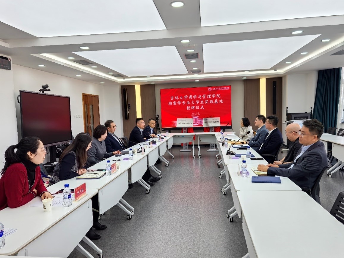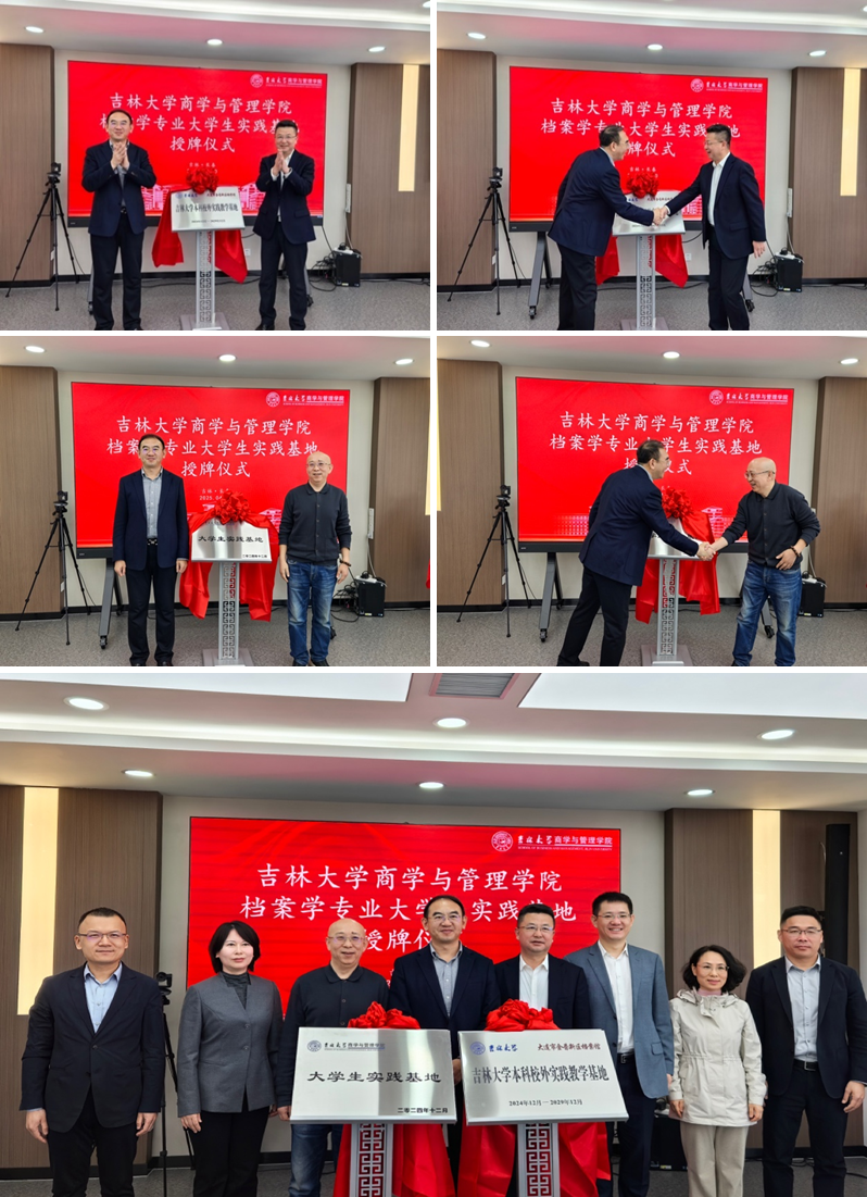 2025年4月10日,吉林大学商学与管理学院与大连金普新区档案馆、大连恒智科技发展有限公司成功举办了档案学专业大学生实践基地授牌仪式。出席此次授牌仪式的有吉林大学商学与管理学院常务副院长隋建利、党委副书记李帅、副书记兼副院长马腾、副院长马捷、信息管理系主任、档案学专业负责人邓君、教学副主任宋雪雁、大连金普新区档案馆馆长侯建军、副馆长葛仁科、四级调研员张颖、大连恒智科技发展有限公司总经理韩长虹、市场与生态合作部经理刘绍昱。授牌仪式由副院长马捷主持。