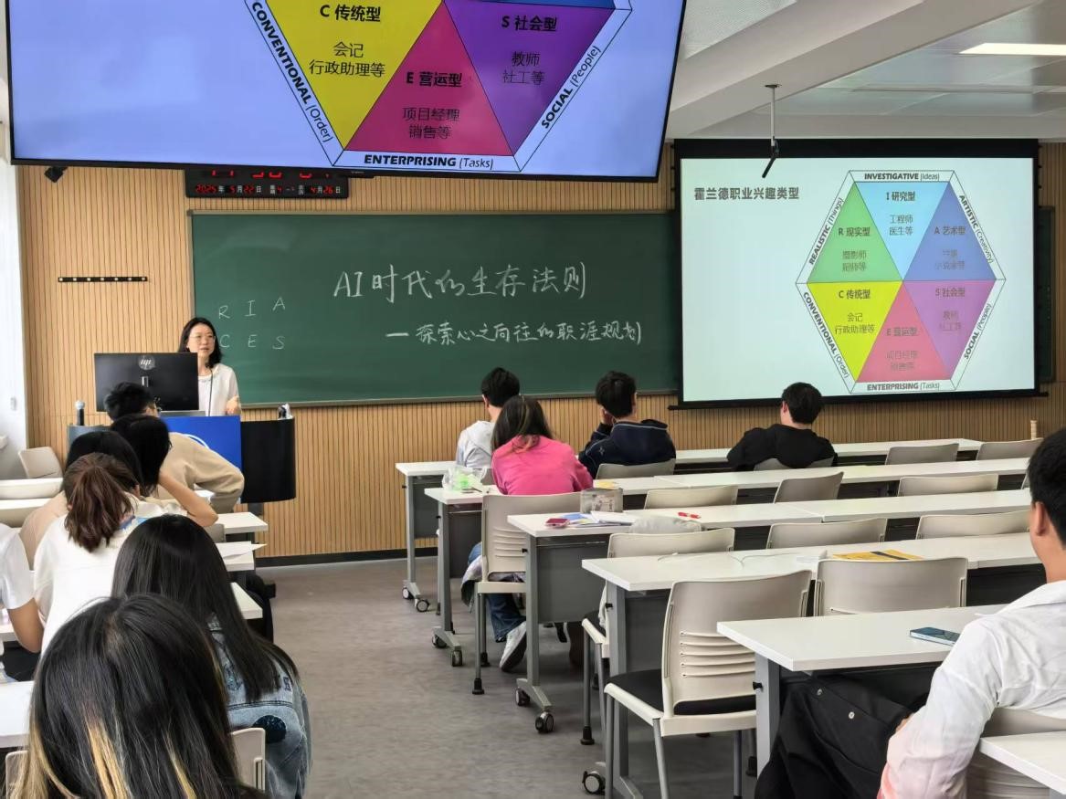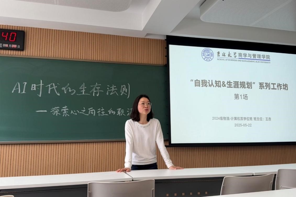 2025年5月22日上午,吉林大学商学与管理学院2024级物流管理-计算机双学位班在敬信楼E507举行“AI时代的生存法则——探索心之向往的职涯规划”主题班会。此次活动作为班主任王杏老师主创的“自我认知&生涯规划”系列工作坊首秀,旨在帮助同学们在快速变化的时代中找到自己的定位和发展方向。整个系列工作坊将一共分成八场进行,贯穿2025年度的两个学期。