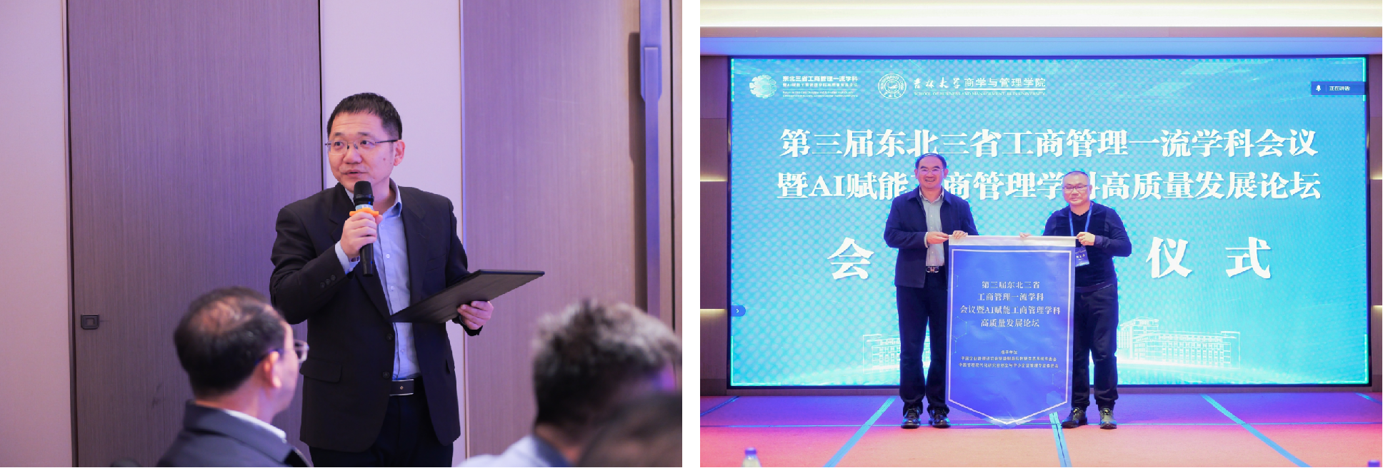第二场主旨报告由东北大学孙新波教授主持。华中科技大学杨治教授作“管理学科发展趋势、挑战与对策思考”主题报告,回顾学科发展趋势,剖析师资短缺、跨学科人才匮乏、研究与教学模式固化等现实挑战,并为学科建设水平的提升提供具体可行的实施路径。东北财经大学郑文全教授以“殊途殊归:企业AI应用类型与资本市场尾部风险”为题,用大语言模型构建AI应用分类测度方法,剖析不同类型AI应用对股价崩盘风险的差异化影响,为企业决策与资本市场监管提供参考。厦门大学吴育辉教授以“人工智能时代下商科人才培养的探索与实践”为题,指出当前商科人才培养面临知识供给滞后、产业需求迭代快、教师角色转型三大挑战,并分享厦门大学管理学院教改实践,为东北三省工商管理学科建设提供经验。