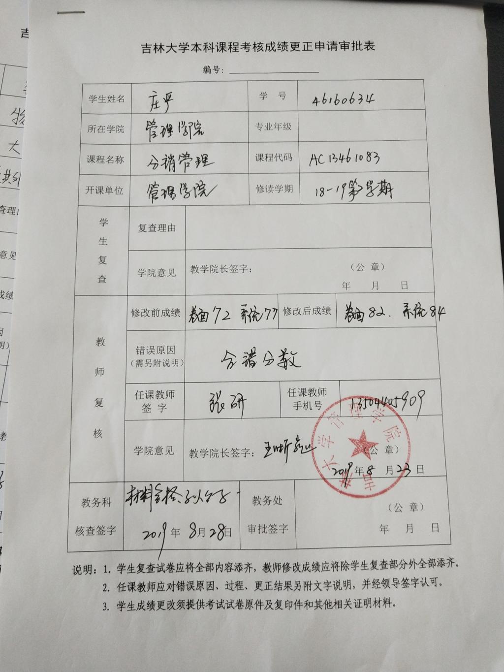 根据《关于进一步明确本科生课程考核等有关问题的通知》(校教字〔2018〕47号)文件有关精神,现对管理学院2016级庄严同学(学号:46160634)2018-2019-2学期课程成绩更正如下: