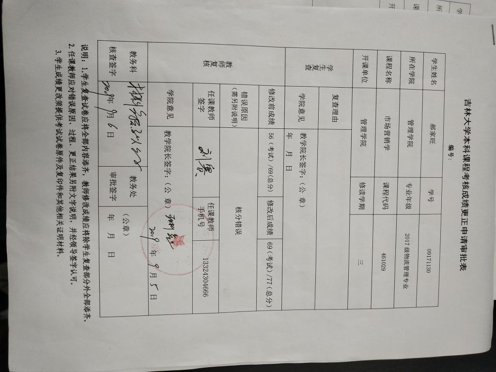 根据《关于进一步明确本科生课程考核等有关问题的通知》(校教字〔2018〕47号)文件有关精神,现对管理学院学院2017级郝家旺同学(学号:09171130)2018-2019-2学期课程成绩更正如下: