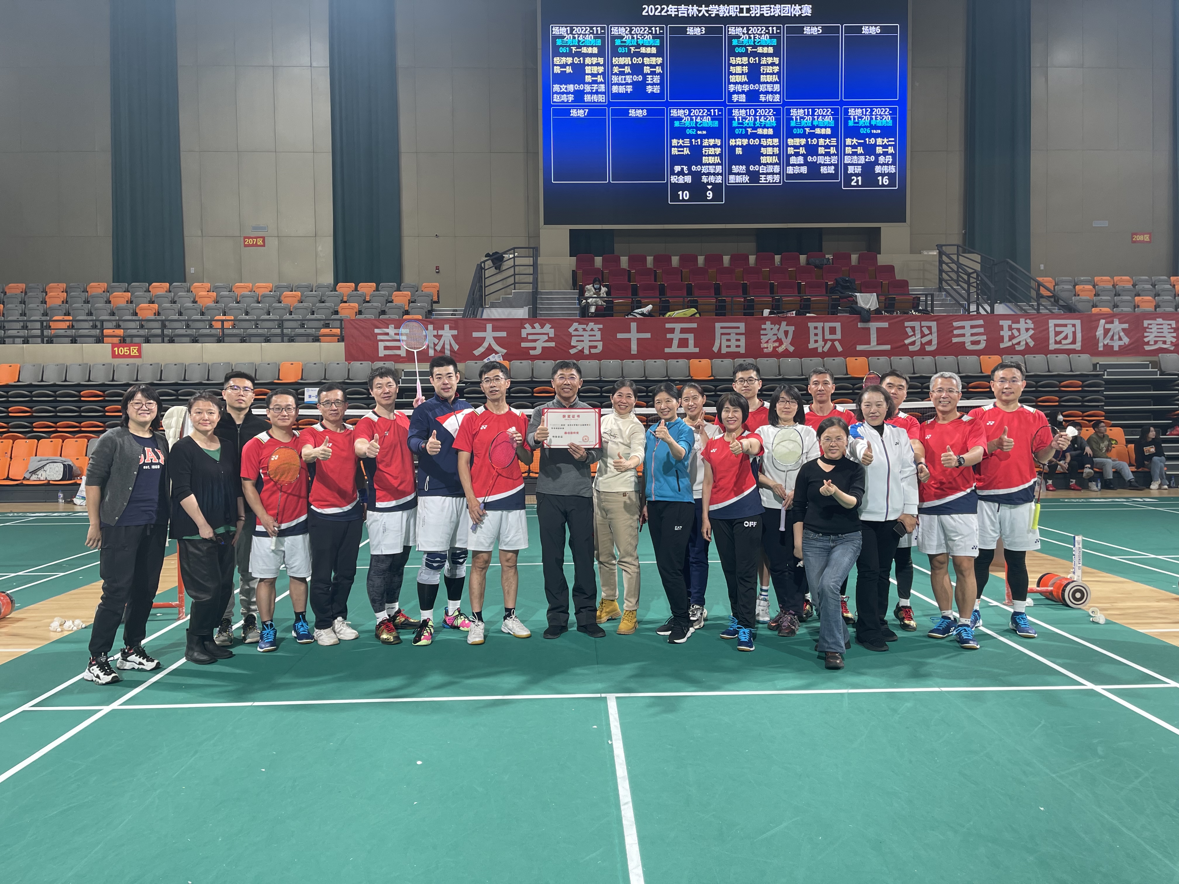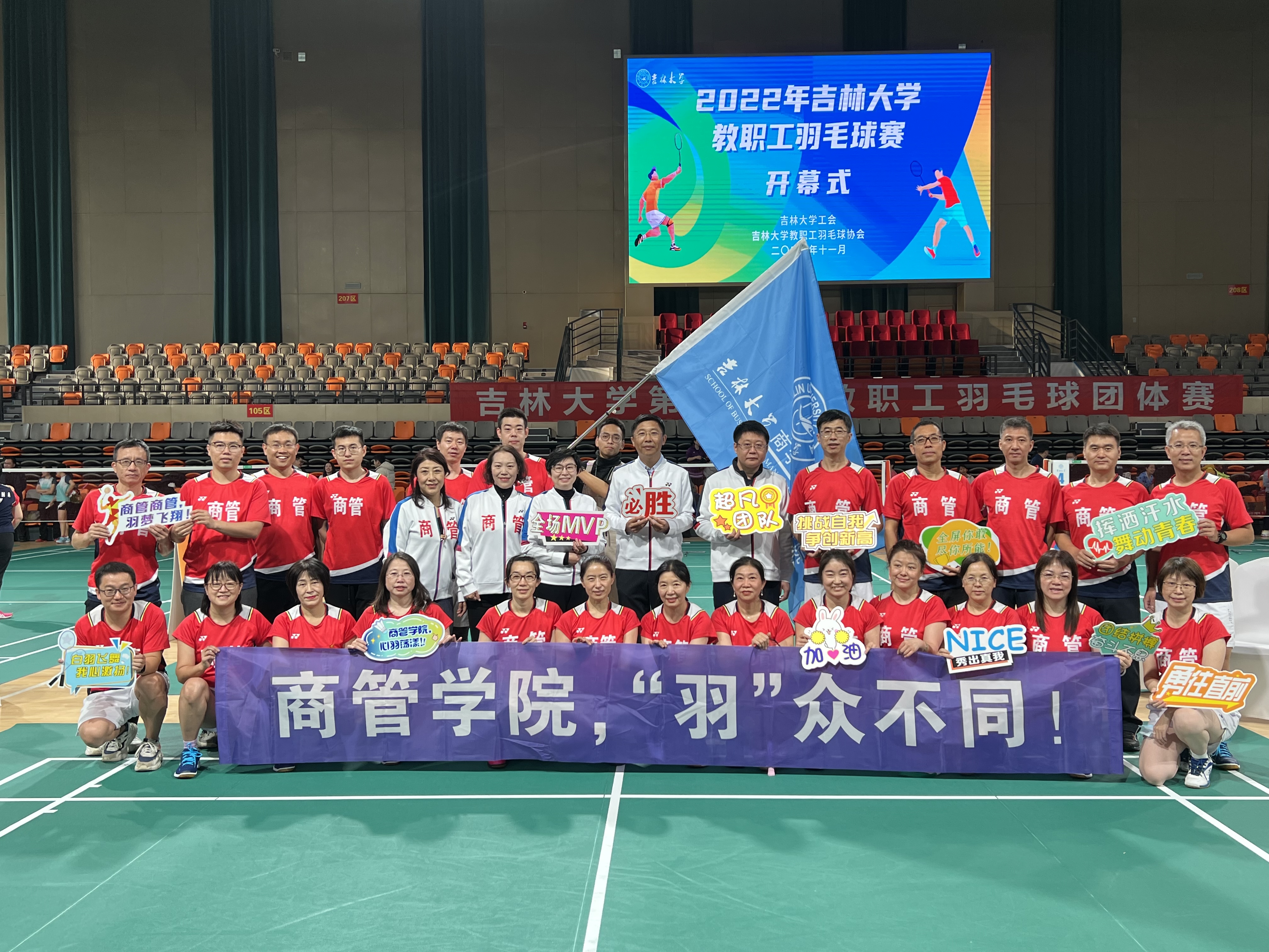 2022年11月19日—20日,吉林大学第十五届教职工羽毛球团体赛在中心校区宋治平体育馆正式开赛,比赛吸引了来自学校的500余名教职工参赛。商学与管理学院工会组织学院爱好羽毛球运动的教职工积极响应,经过前期的精心准备,组建了男子、女子各两支队伍,共计32名教职工参加了男子乙组团体(全校共32支代表队)、女子团体(全校共25支代表队)两项赛事,经过两天的激烈角逐,四支队伍顺利完赛。